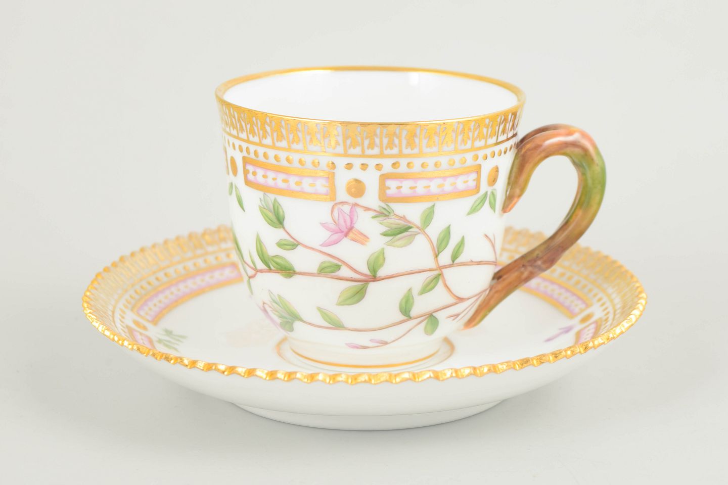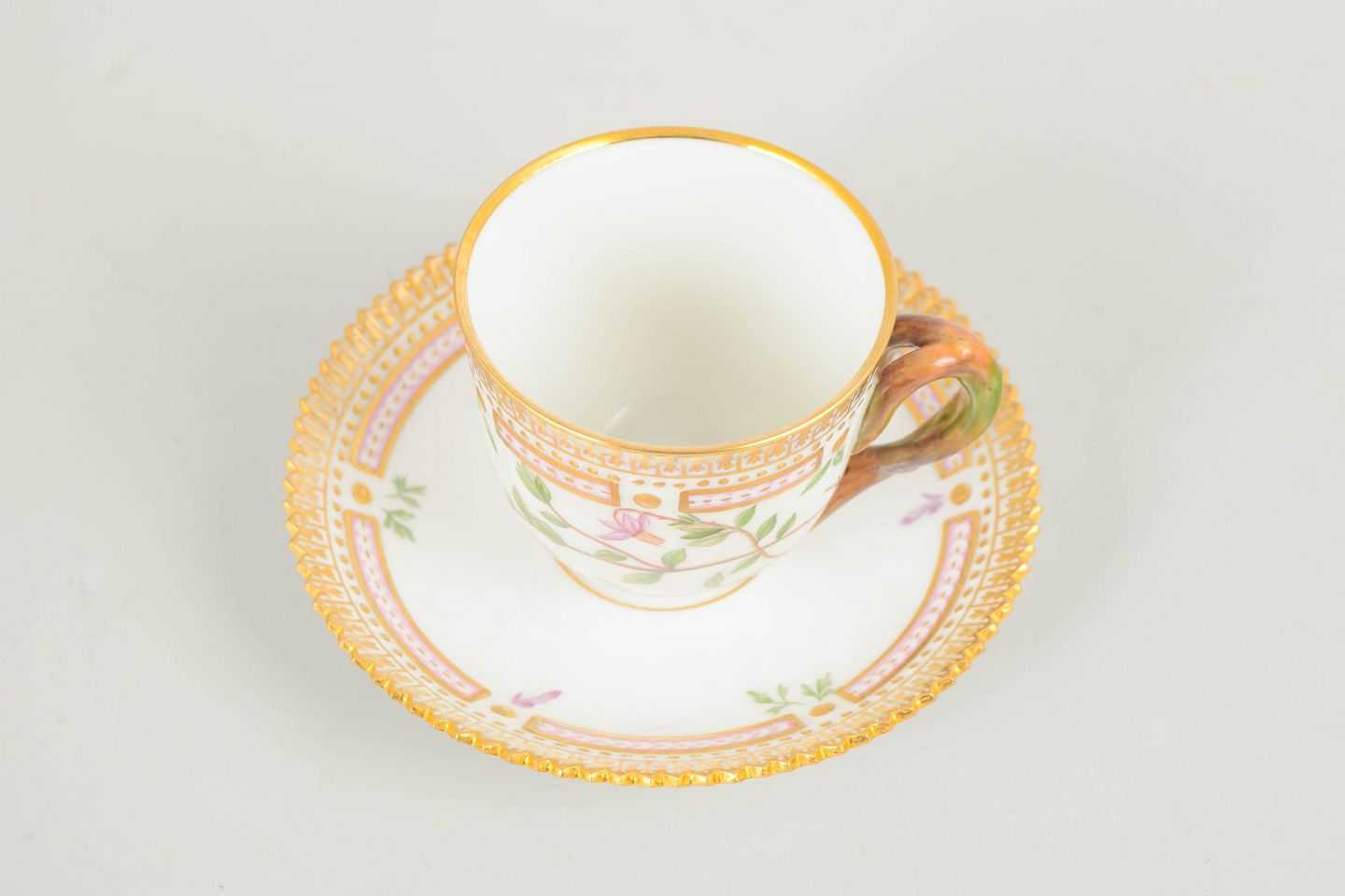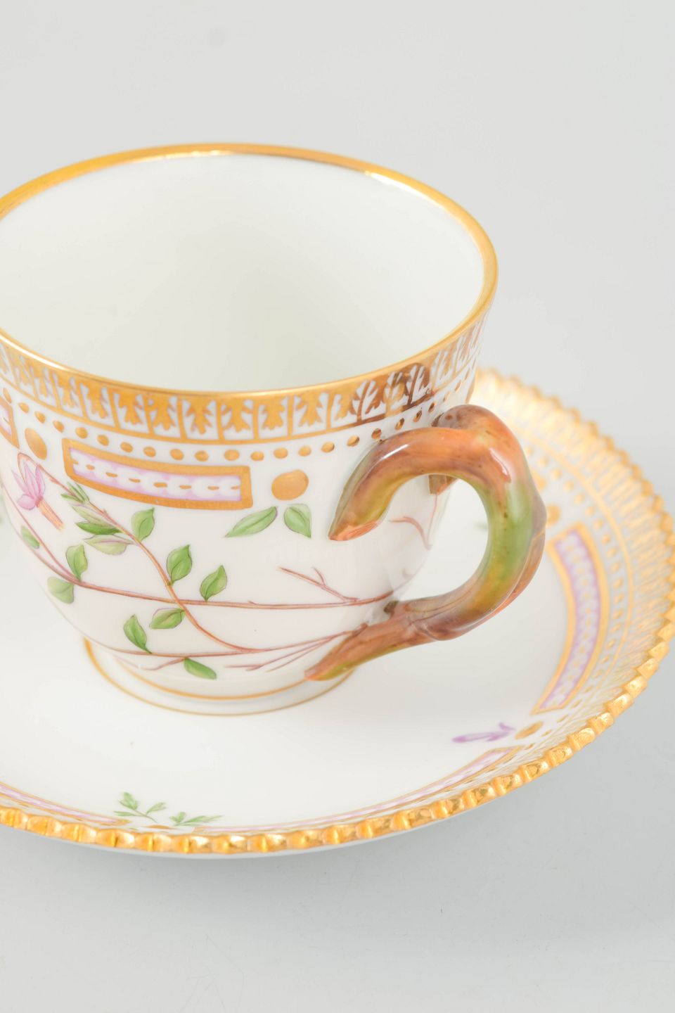 Elegant demitasse cup with matching saucer from the iconic Flora Danica service. The cup is hand-painted with a botanical motif derived from the Flora Danica publication and executed in the service’s characteristic refined form with a decorative rim. A classic and exclusive cup.