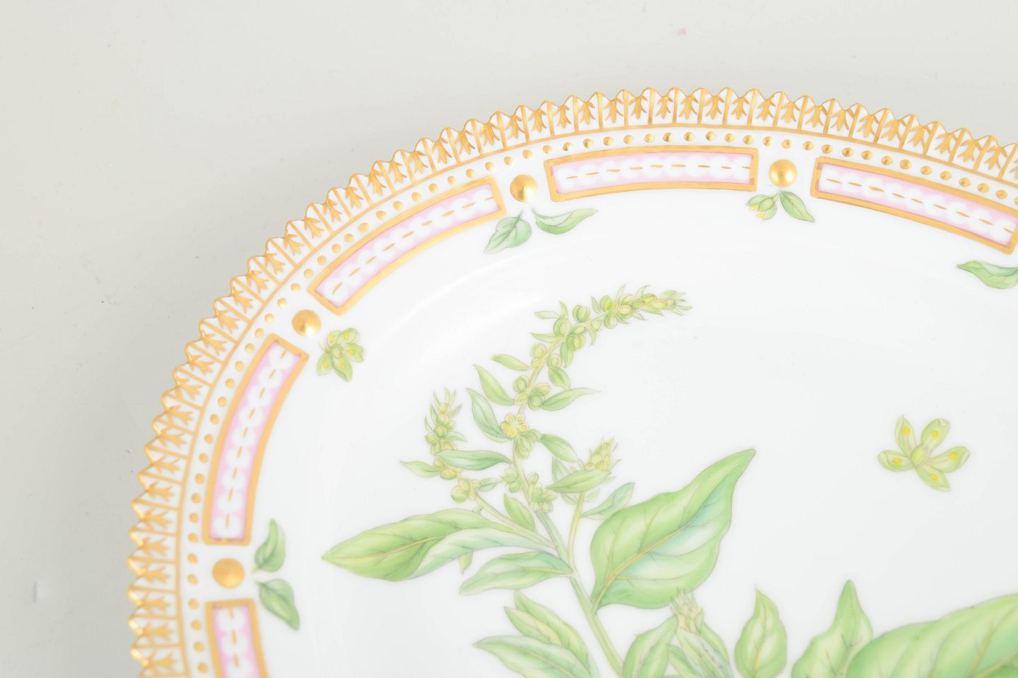 Ovalt serveringsfad i Flora Danica med håndmalet botanisk dekoration efter originale kobberstik fra Flora Danica-værket. Fadet er udført i hvidt porcelæn med fint gennemarbejdet gennembrudt rand, forgyldt kant og detaljer i rosa og guld. En klassisk serveringsform fra Royal Copenhagens sene 1900-tals produktion.