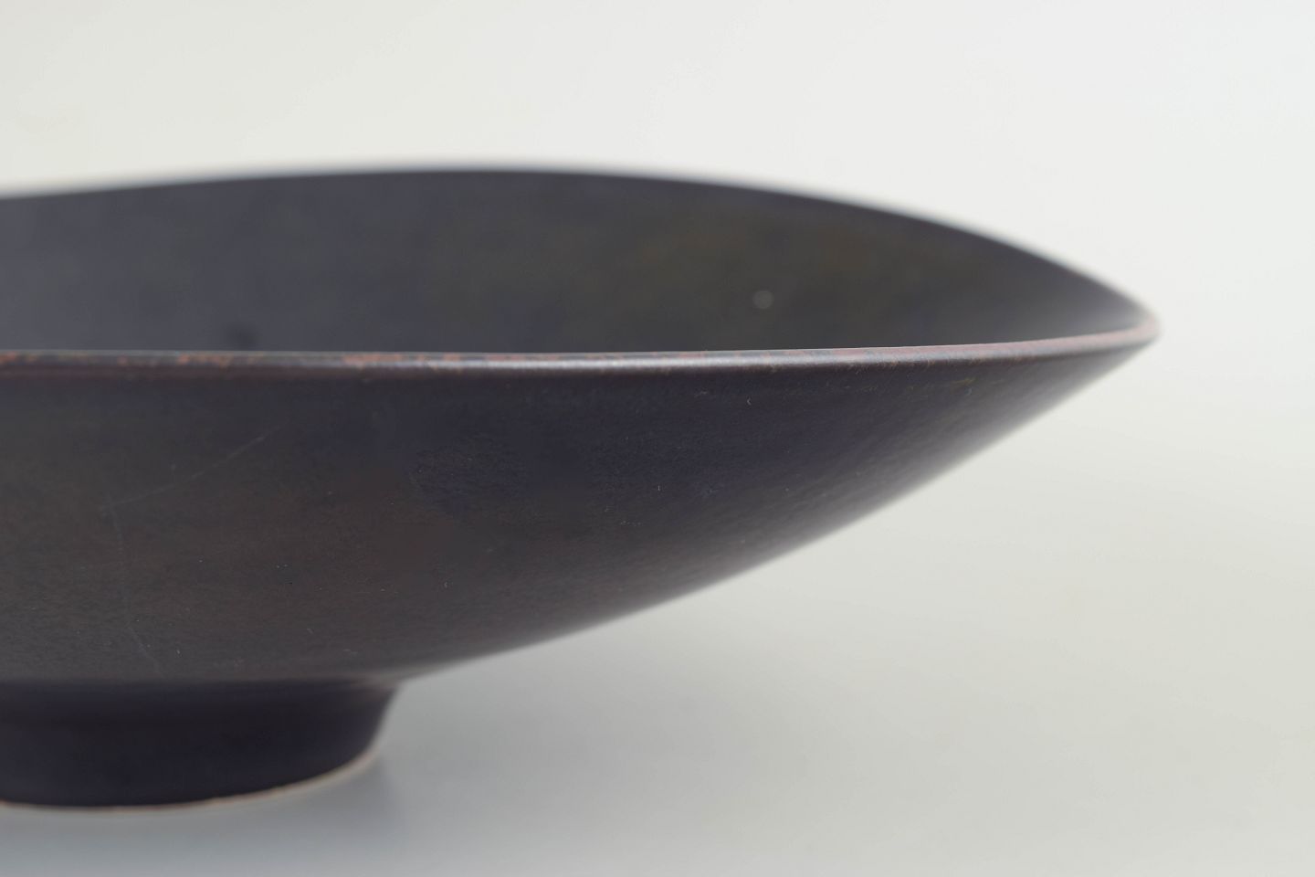 Stor, lav skål i stentøj med bred, åben form og let hævet fodring. Udført i afdæmpet, mørk glasur med mat overflade, der fremhæver den rene silhuet og den sikre proportionering. Et karakteristisk eksempel på Carl-Harry Stålhanes modernistiske formsprog hos Rörstrand i midten af det 20. århundrede, hvor enkelhed og materialefornemmelse er i fokus.