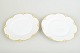 To franske middagstallerkener i hvid fajance med bølget fane og dekoration i forgyldt kant samt stiliserede, Art Deco-inspirerede gulddetaljer langs randen.