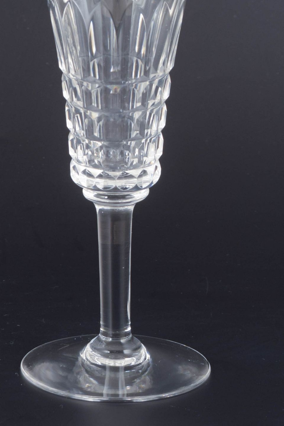 Sæt med fire franske champagneglas i klart krystal med facetteret kumme og klassisk stamme. Form og slibning giver et elegant lysspil og et tidstypisk udtryk fra midten af det 20. århundrede.