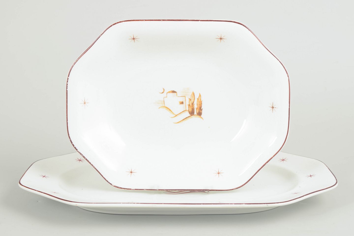 Dishes in glazed earthenware with a scalloped form, brown border line and star motifs, featuring a central oriental landscape motif. Orient model. Two sizes.