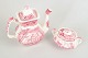 Kaffekande og sukkerskål i fajance fra Mason’s og Palissy, dekoreret i rød transferware med landskabs- og arkitekturmotiver.
