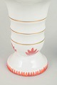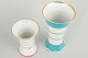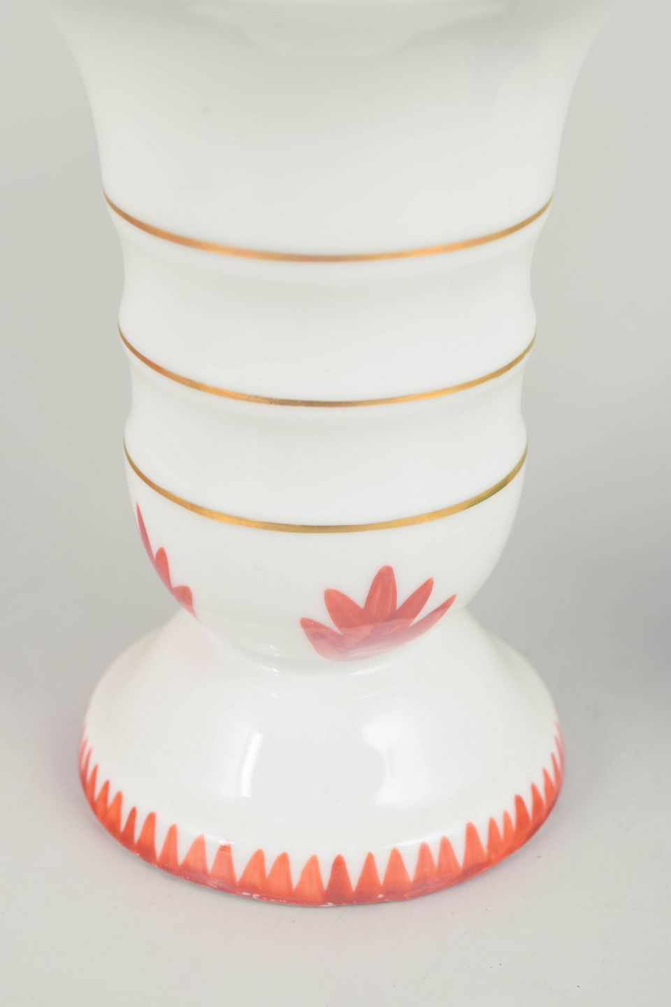 To vaser i porcelæn med klassiske art deco former og dekoration i hvide, turkise og røde nuancer med stafferinger i guld. Vaserne fremstår med elegante proportioner og karakteristisk stil fra tysk porcelænsproduktion i mellemkrigstiden.