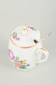 Håndmalet porcelæns sennepskrukke dekoreret med saksisk blomst, model 493/1595, med tilhørende sølvske fra Hans Hansen.
