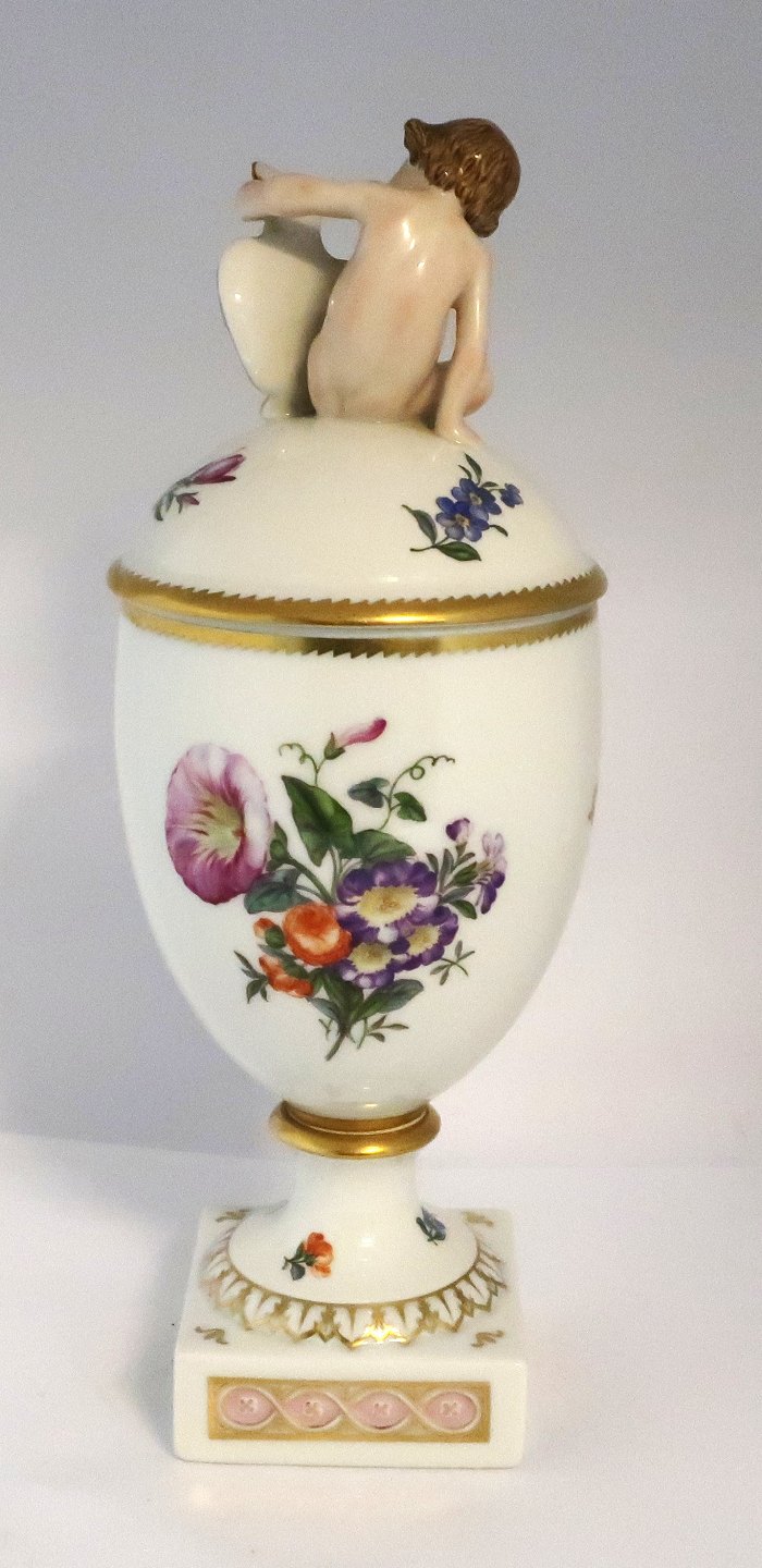 Royal Copenhagen. Saksisk blomst. Lågpokal med putti på låget. Model 1754. Højde 30 cm (1 sortering)