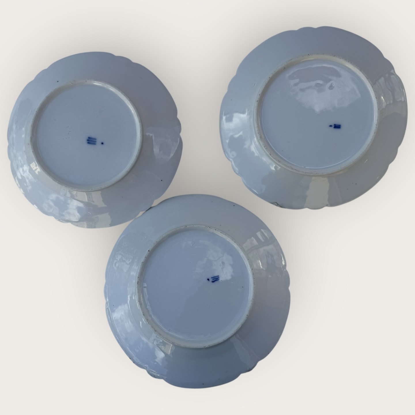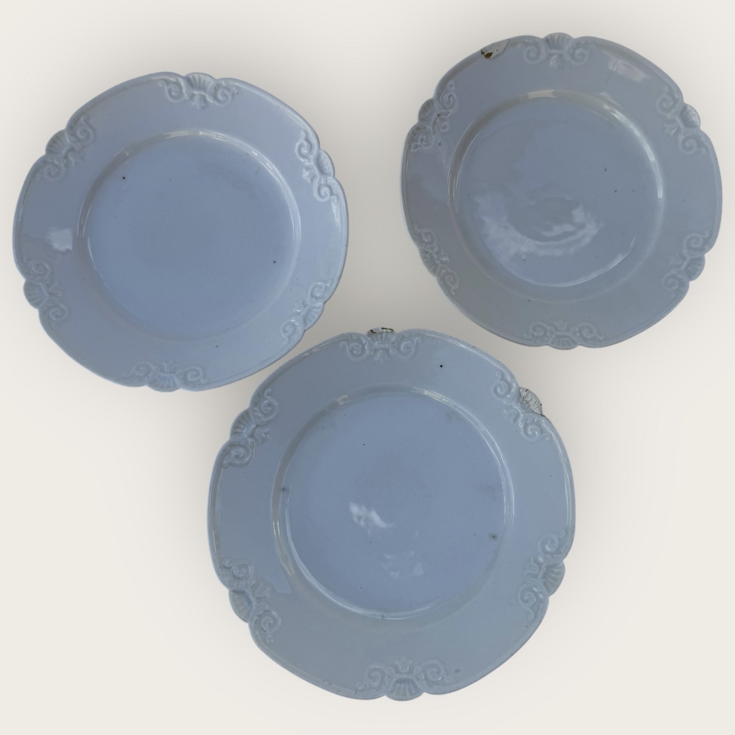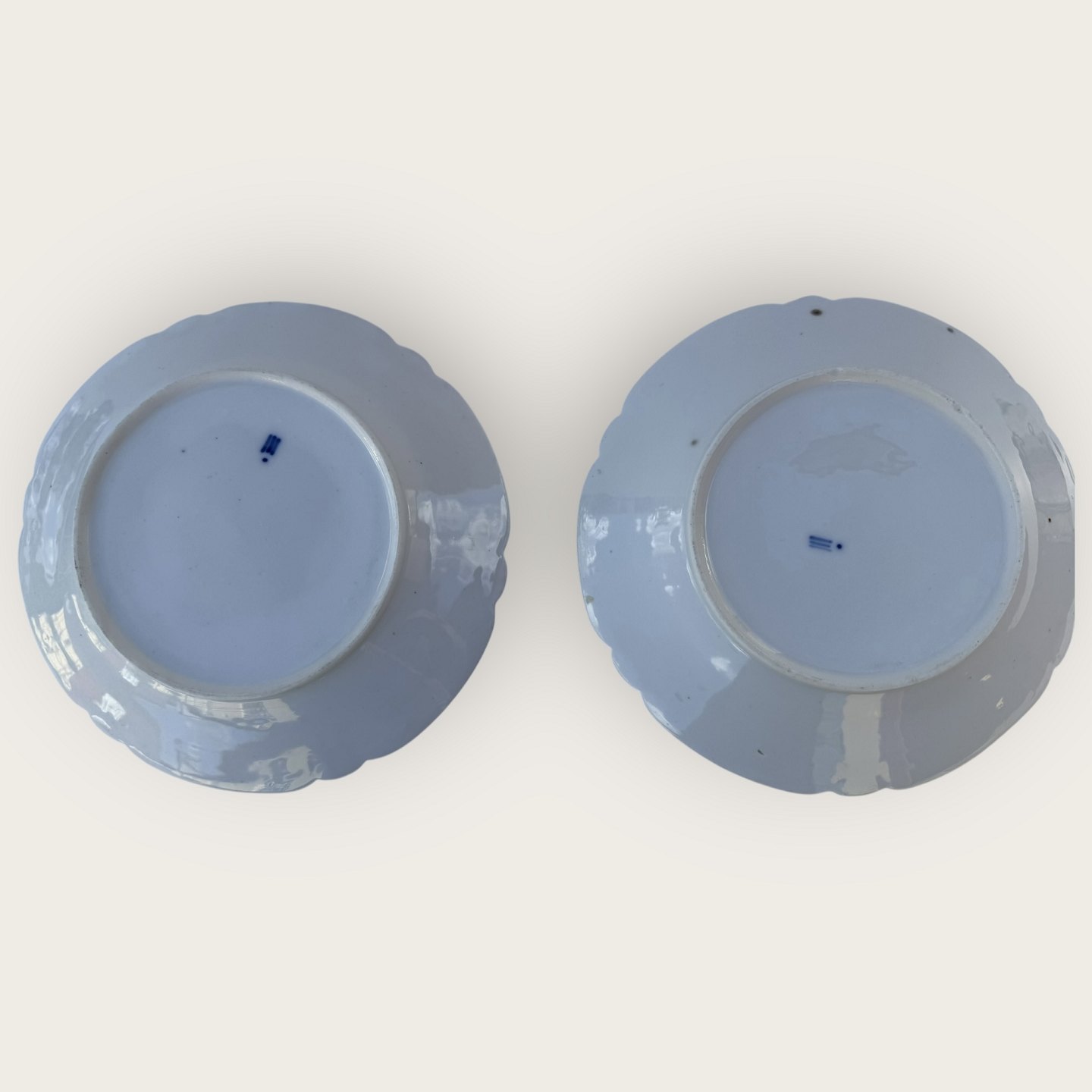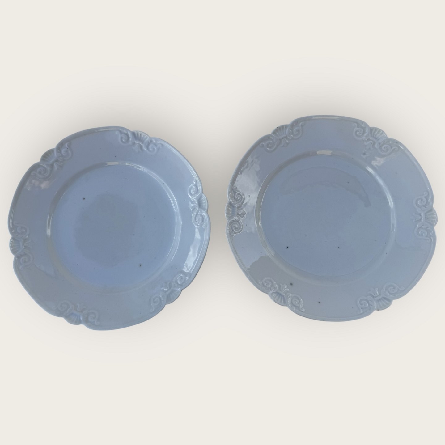 Royal Copenhagen, Rokoko weiß / Rokoko hvid, flacher Teller, 19 cm Durchmesser, 2 Stück in schönem, leicht patiniertem Zustand, wir haben auch 3 Stück mit Mängeln/Reparaturen für je 125 kr (siehe die letzten 2 Fotos)