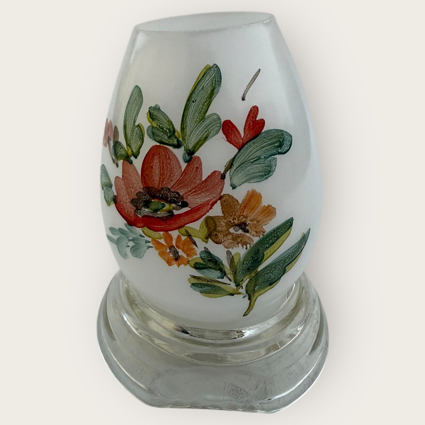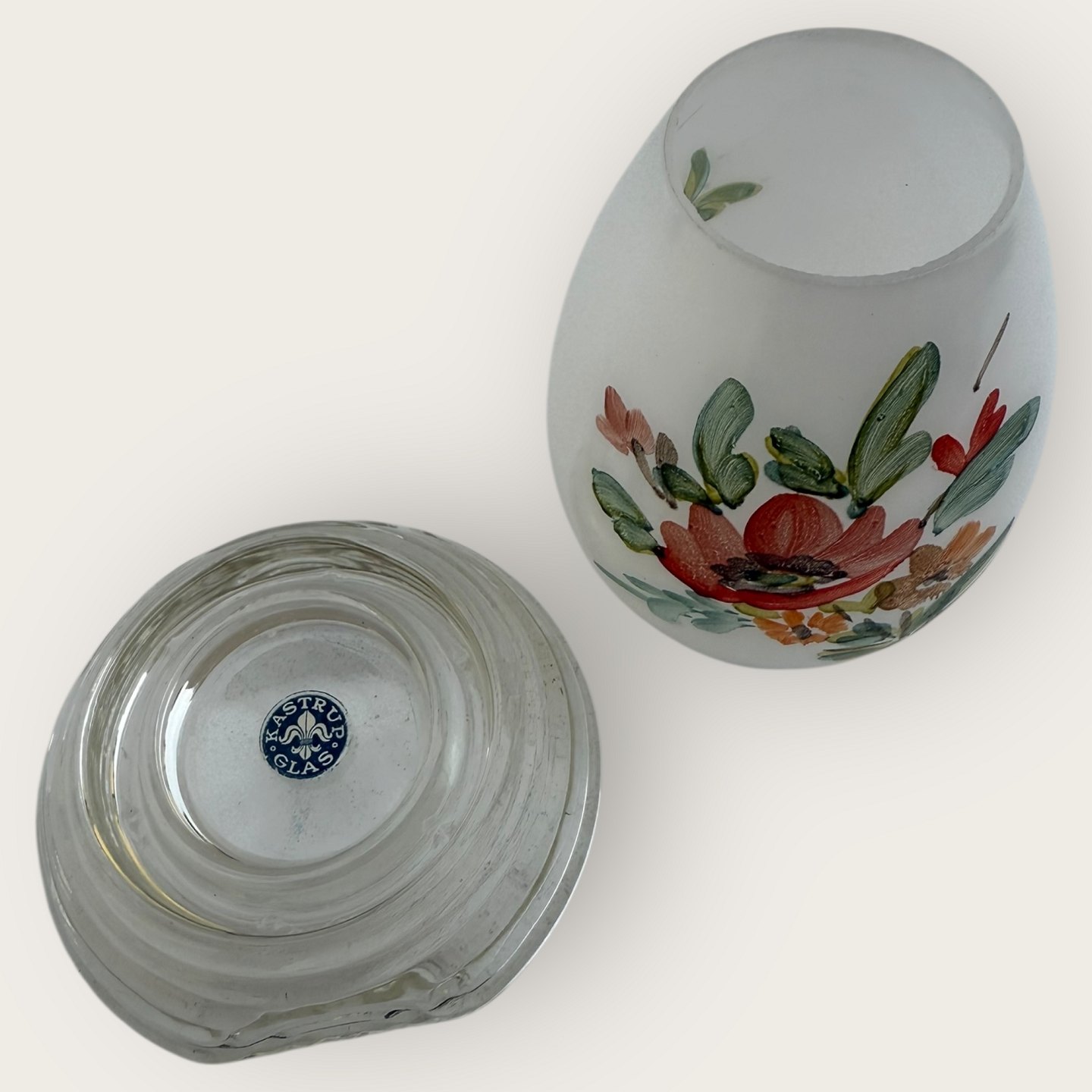 Kastrup Glasværk, hyggelampe med håndmalet blomsterdekoration til fyrfadslys, ca. 9cm høj *Flot stand med original mærke på underdel*