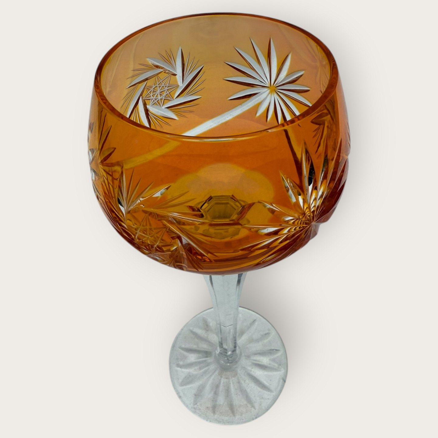 Bøhmisk krystal glas, Vin glas med slibninger, Gul, 19,5cm høj, 8cm i diameter *Perfekt stand*