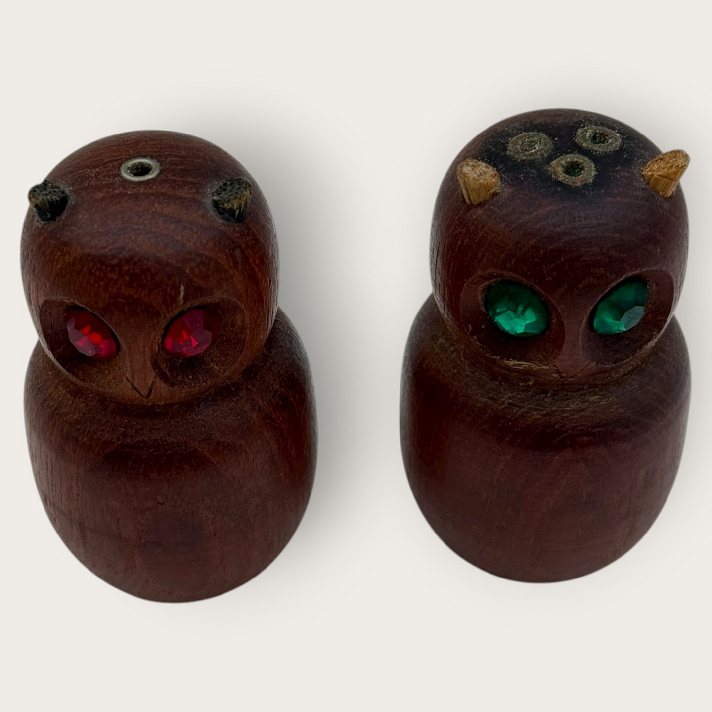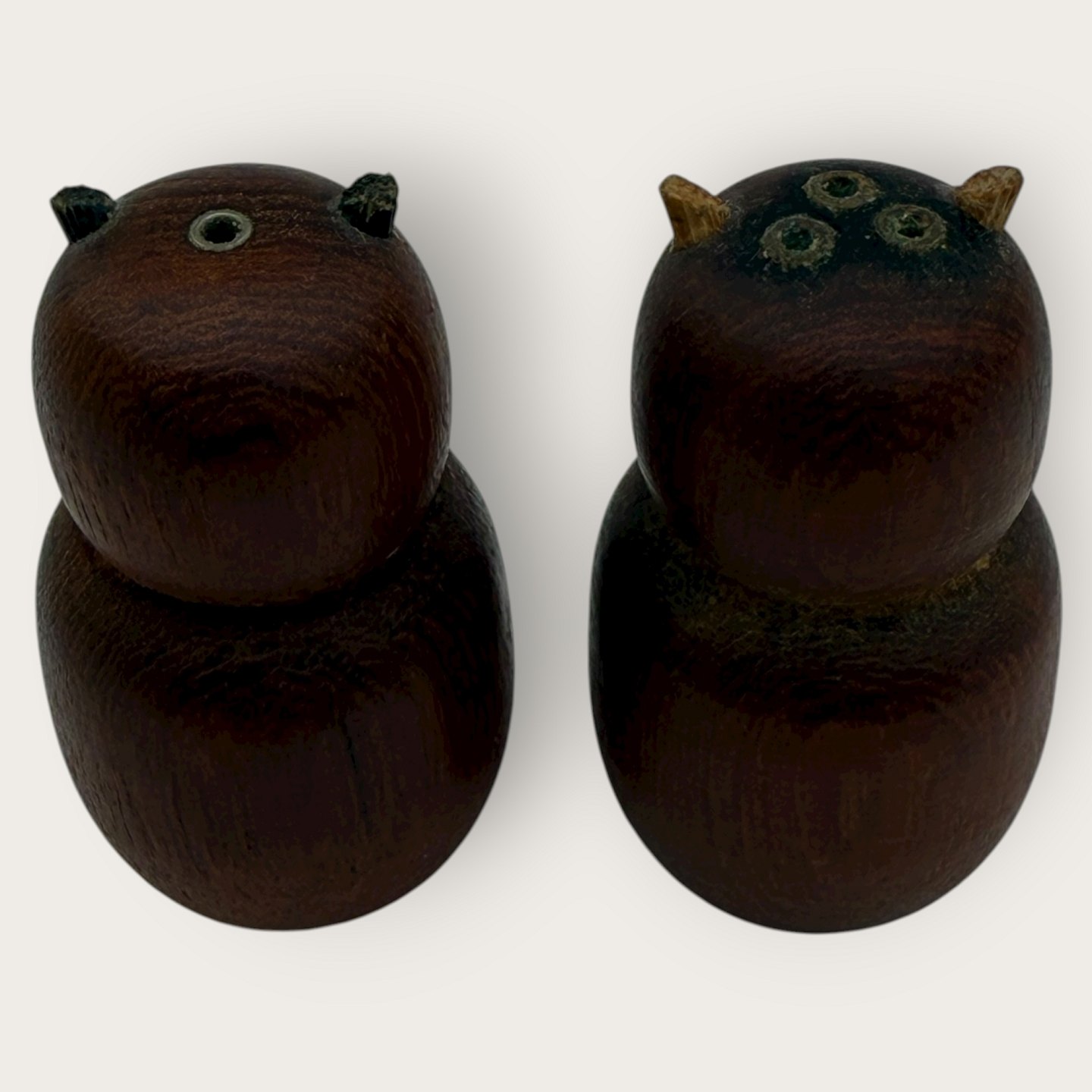 Salt og pebersæt i teaktræ fra 1960'erne, fugle / ugler med grønne og røde øjne, fremstår pænt patineret og uden bundpropper.