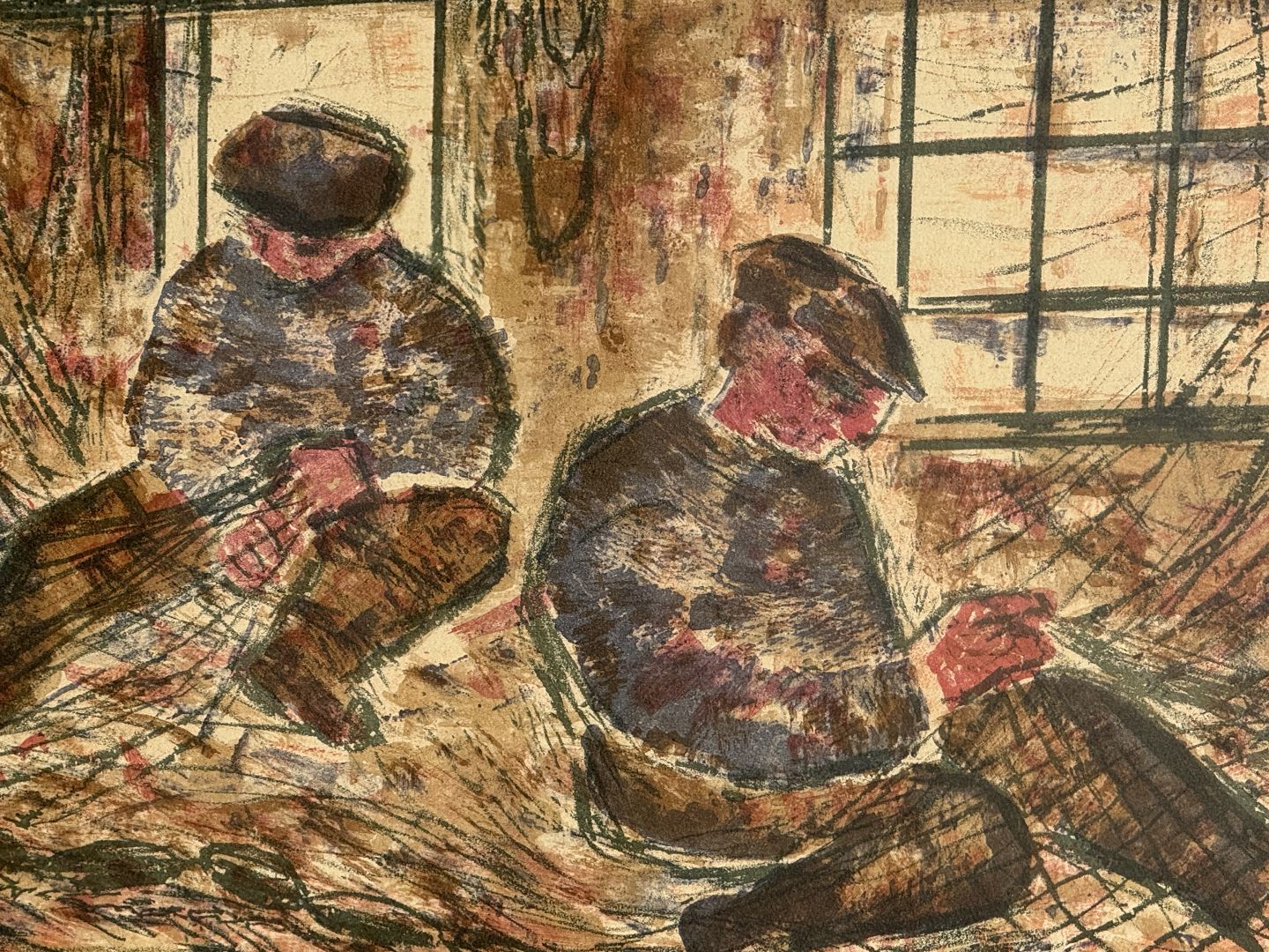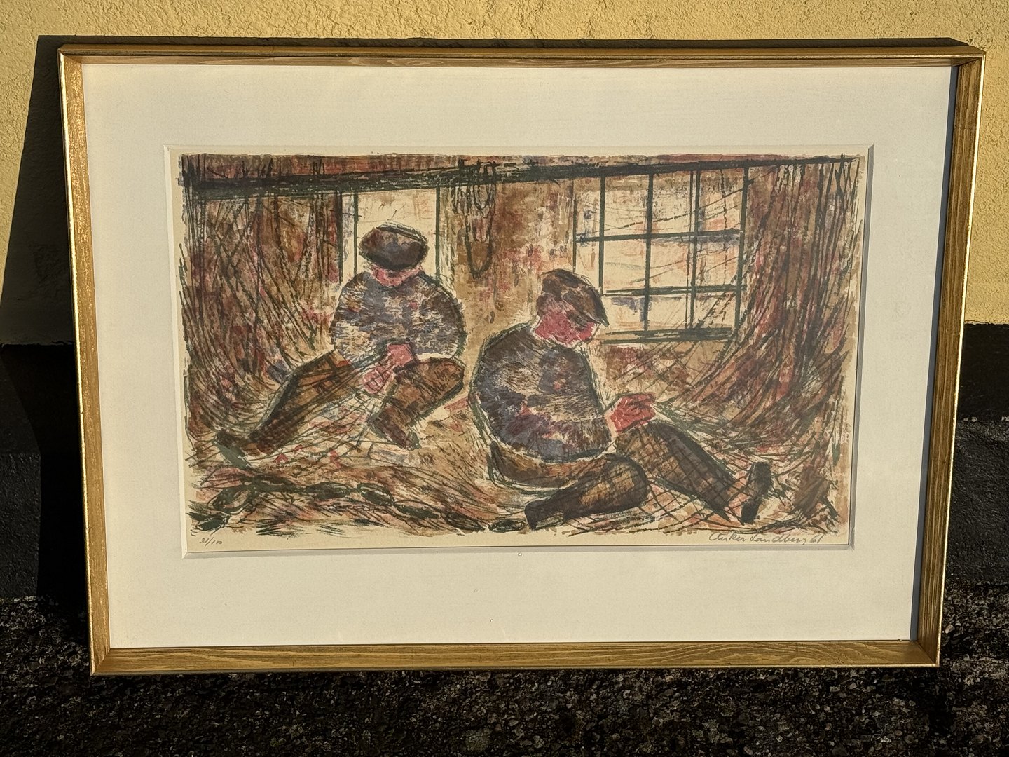 Anker Landberg, Litografi i ramme, Fiskere ordner garn, signeret Anker Landberg 61 og 31/100, Mål med ramme: 66x48cm *fin stand*
