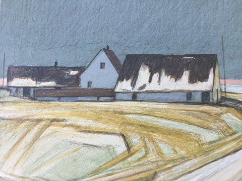 Erik Nørgaard (1920-97): Nordjysk landskab med gård, vinter. Farvelitografi på papir. Nummer - 53/70 Sign.: Erik Nørgård (bly) Indrammet i aluramme med lækker passepartout. 39x65 (54x78)