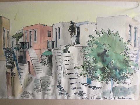Nis Andersen (20 årh): Parti fra Paros, Grækenland 1954. Akvarel på papir. Sign: Nis Andersen Betegnet - Paros 23. juni 54. 21x32 (28x38)