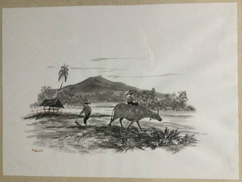 Ubekendt indonesisk kunstner (20 årh): Indonesiske markarbejdere. Tusch/bly på papir. Sign.: U...?? 27x37 (39x49)