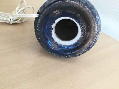 Michael Andersen Keramik, Bornholm: Bordlampe. Grå krakelé glasur med blå kubistisk dekoration. Stemplet for Michael Andersen og Nr. 6102 Højde uden fatning 36 cm Diameter bund 12 cm.