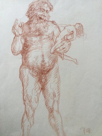 Robert Büchtger (1862-1951): Trold med nøgen pige. Rødkridt på papir. Sign.: R.B. Uden ramme. Bladet måler 28x21 32322