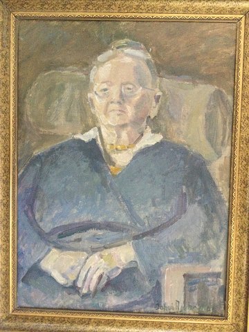 Jakob Agersnap (1888-1958): Siddende, ældre kvinde i interiør 1945. Olie på lærred, Sign.: Jakob Agersnap Bagpå lærred - Jakob Agersnap Esbjerg 1945. 55x41 (65x51) 9312