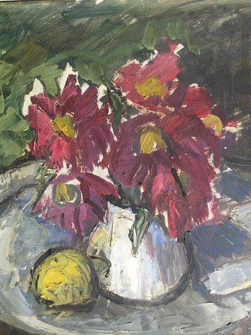 Ruth Weber (1894-1977): Opstilling på bord med blomster i vase og frugt. Olie på plade. Sign.: Ruth Weber 50x45 (57x52)