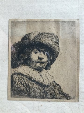 Rembrandt van Rijn (1606-69): Portræt 1638 - "Man in a Broad-Brimmed hat" Kobberstik på papir. Beskåret tæt på pladen Antagelig senere tryk. Usigneret Plademål 8x7 Indrammet 20x16 19325
