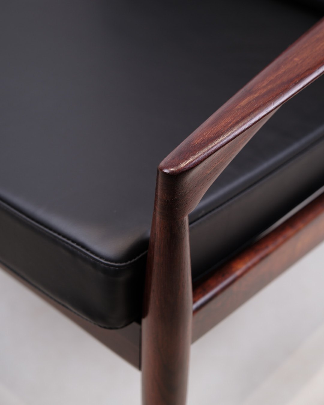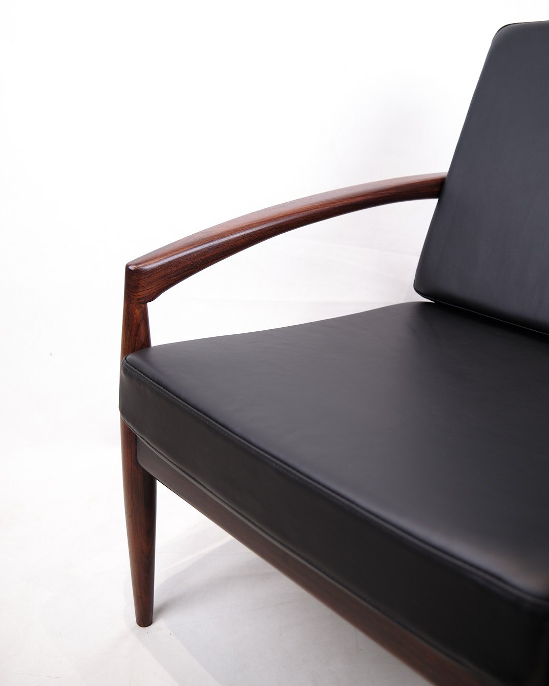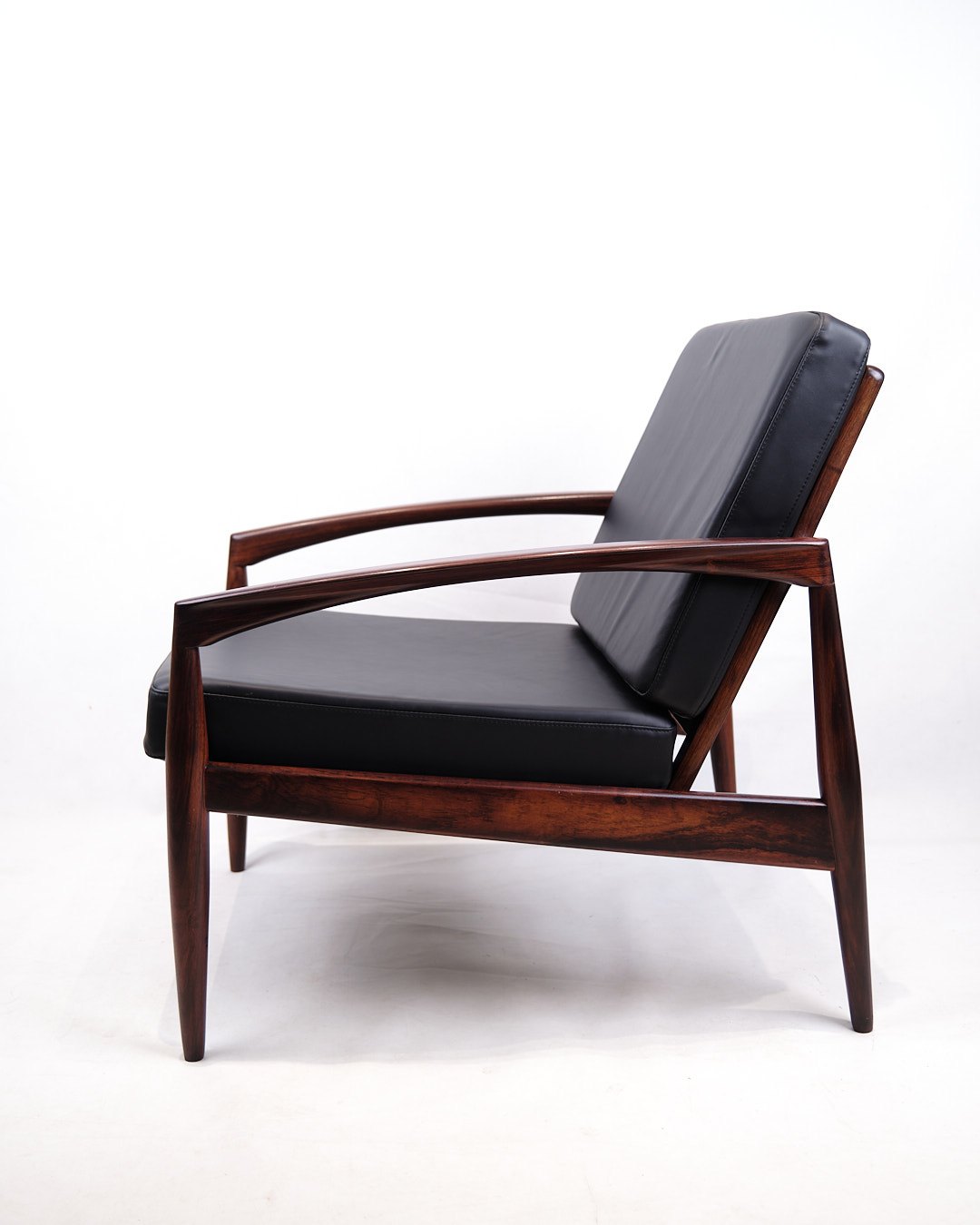 SolgtKai Kristiansen “Papirknivstolen”, model 121. Palisander og sort læder. Produceret af Magnus Olesen, 1950’erne.