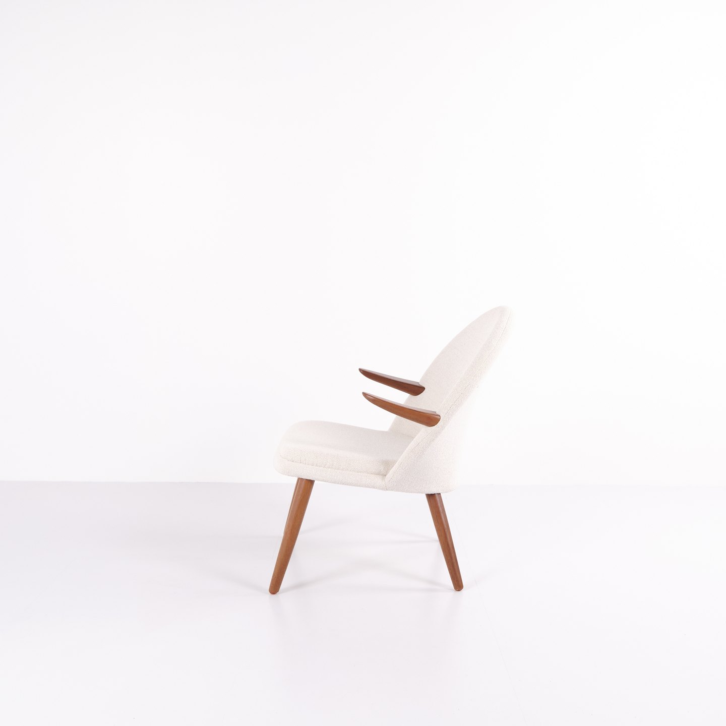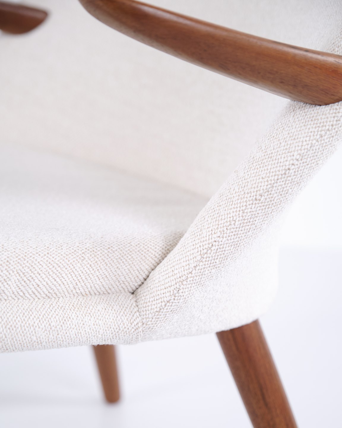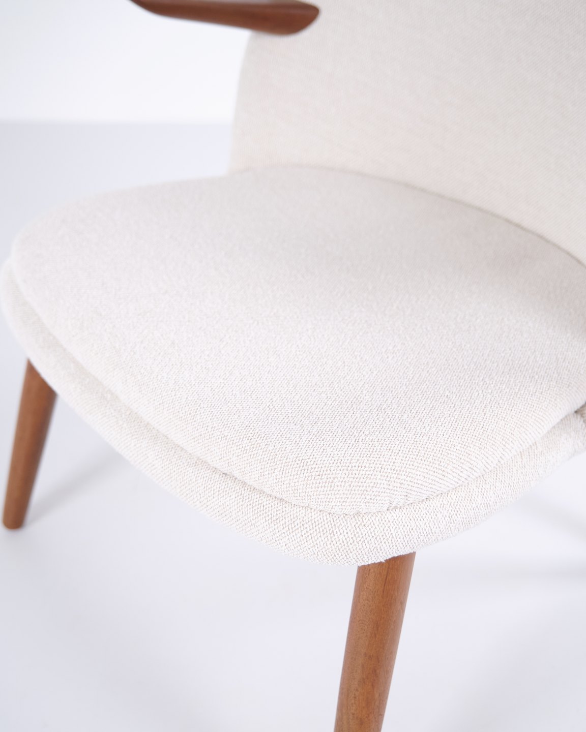 Kurt Olsen lænestol fra Glostrup Møbelfabrik. Teaktræ med lyst stof, 1960’erne.