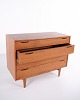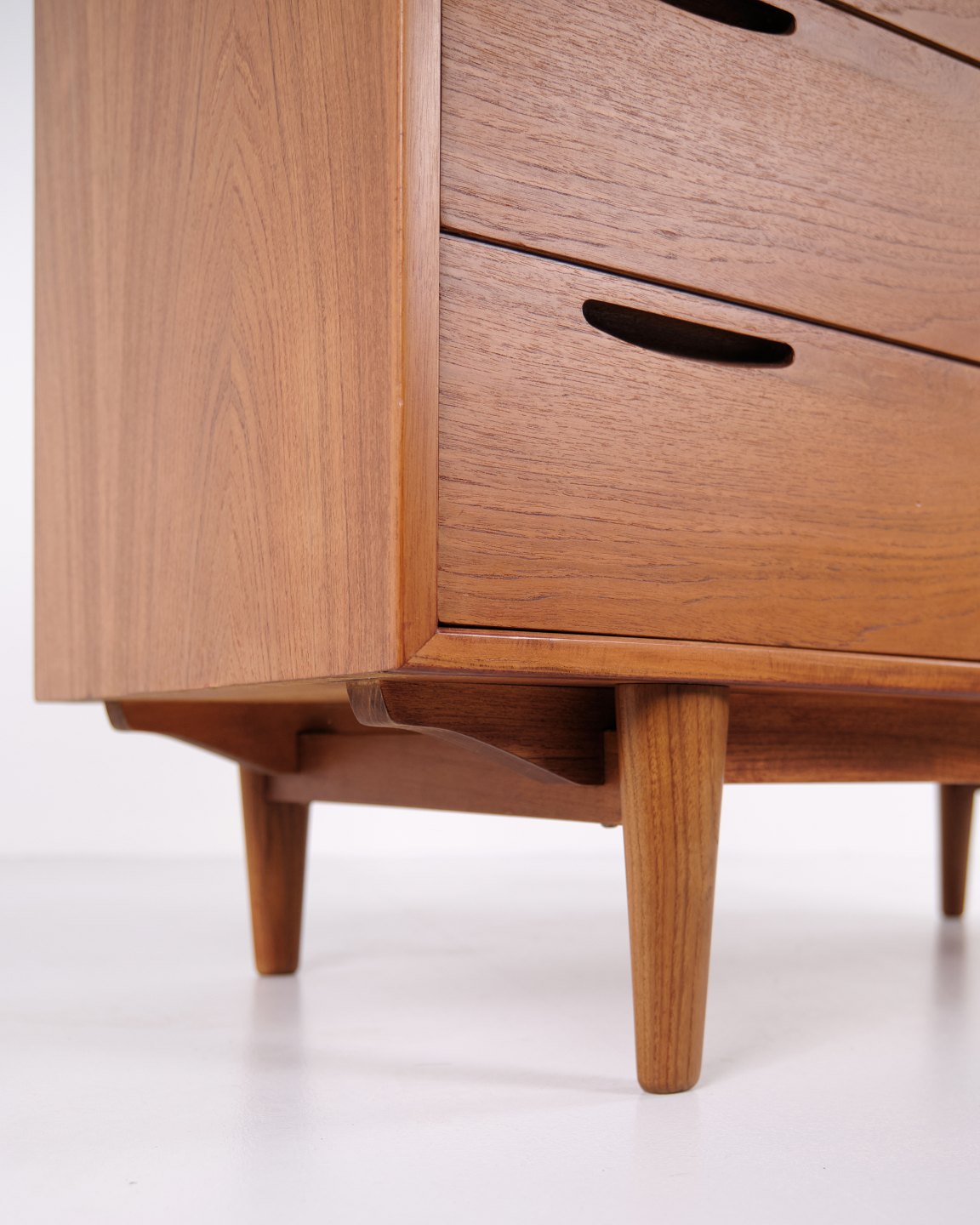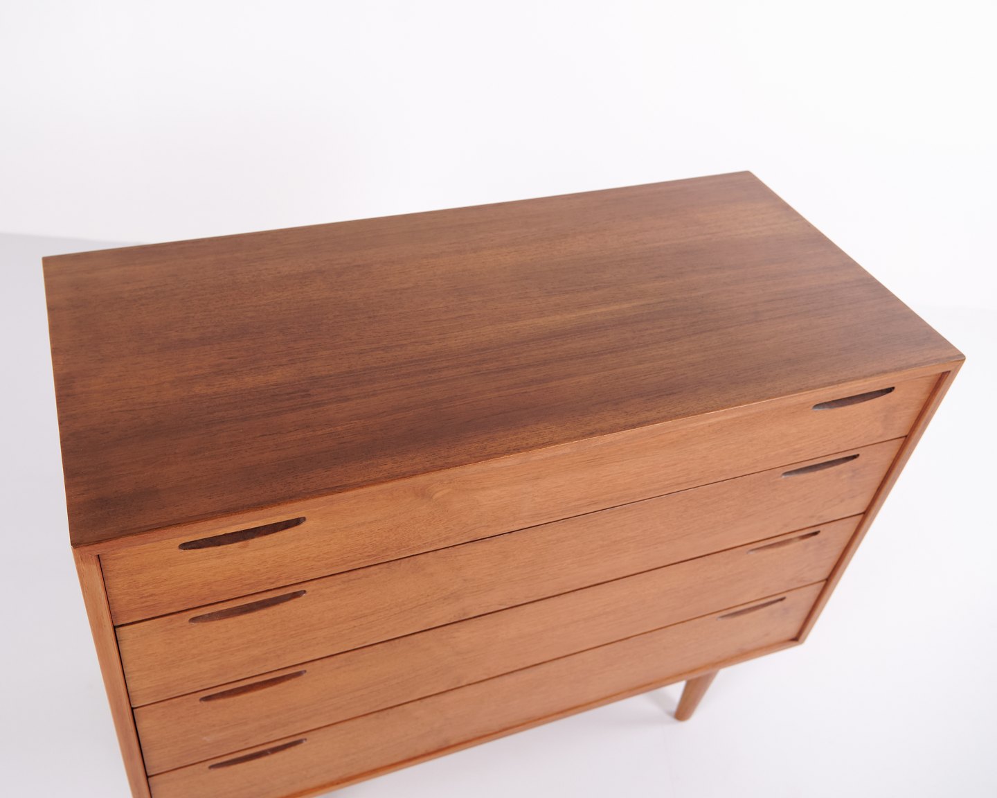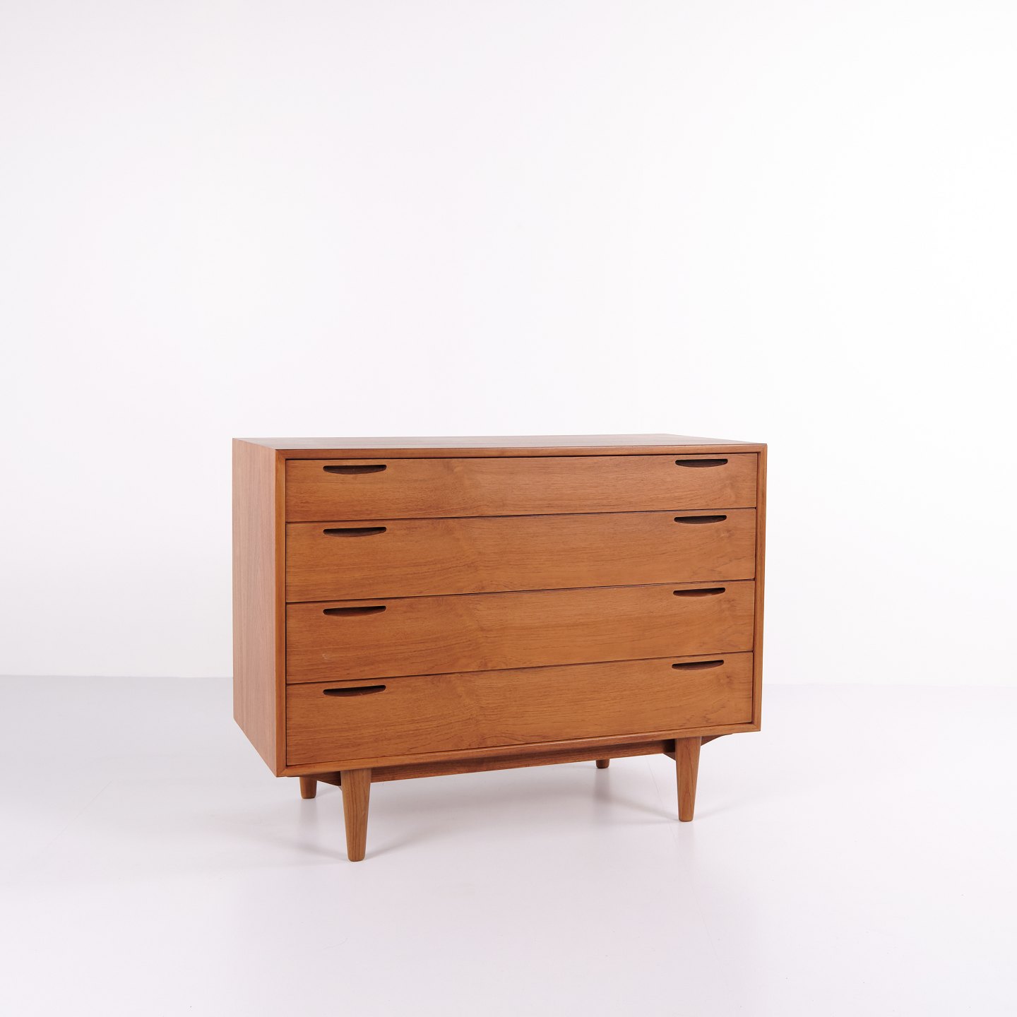 Kommode designet af Ib Kofod-Larsen og fremstillet af Brande Møbelfabrik i 1950’erne. Kommoden er udført i teaktræ med fire rummelige skuffer og karakteristiske, enkle greb, som understreger Kofod-Larsens rene og funktionelle formsprog.