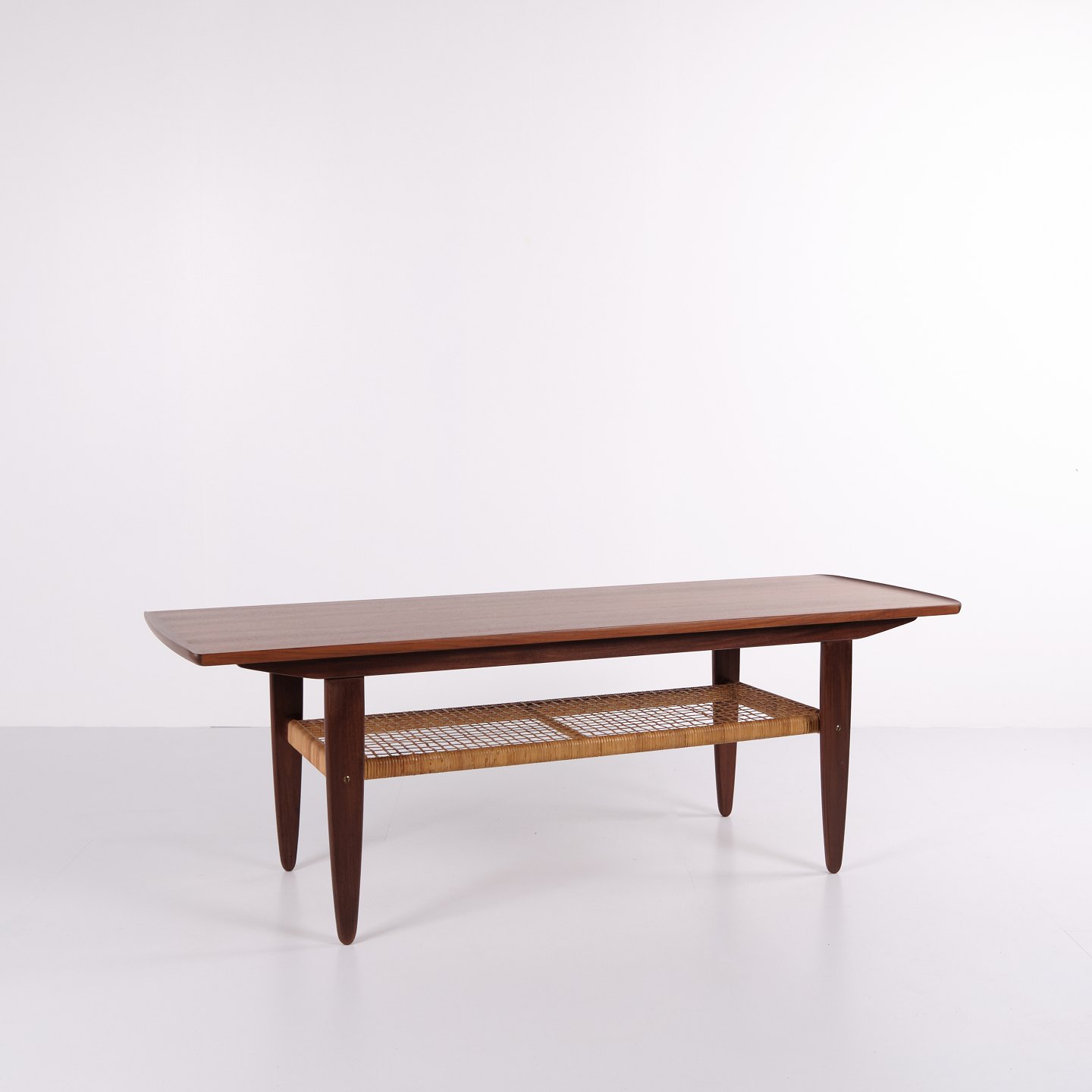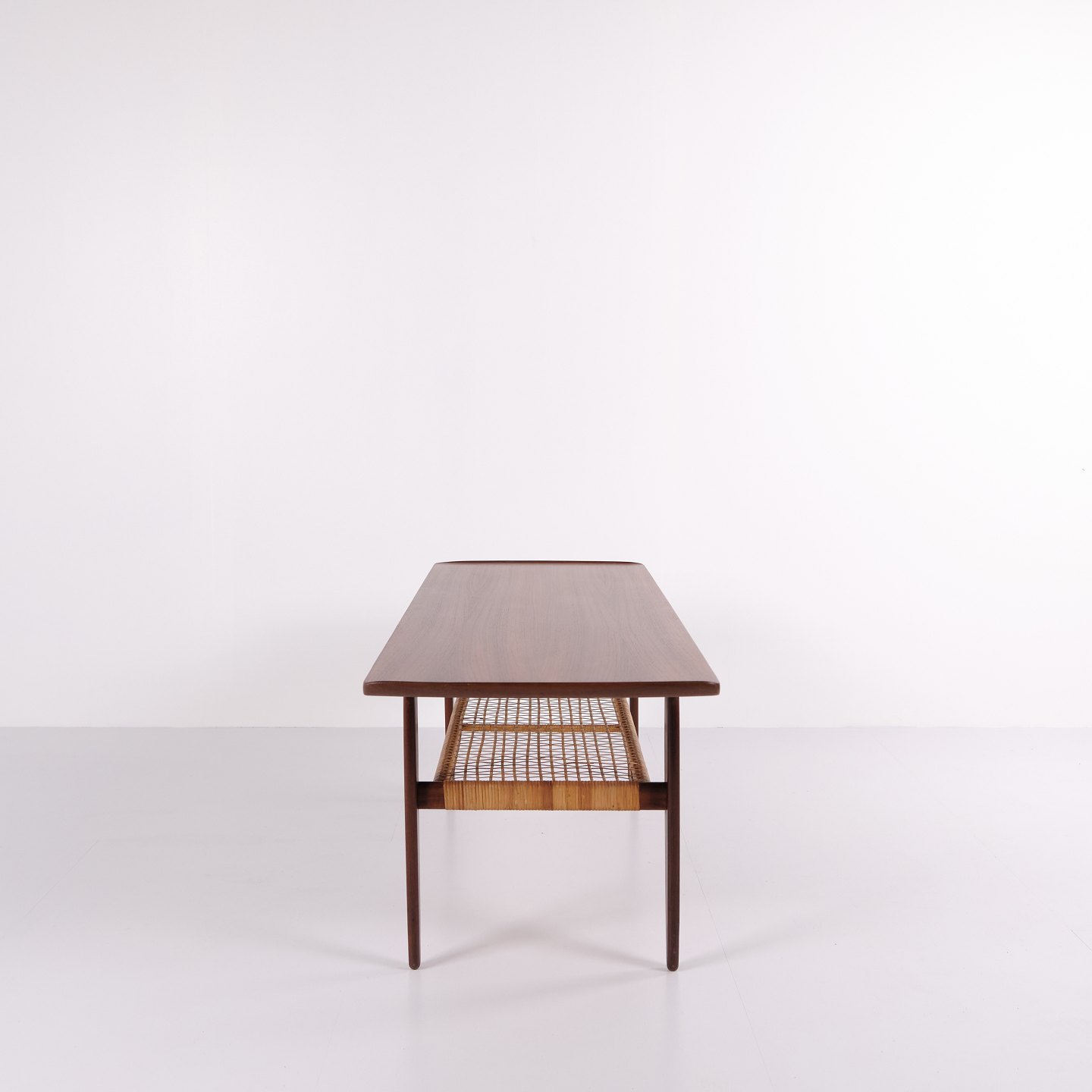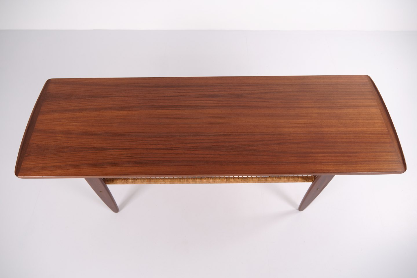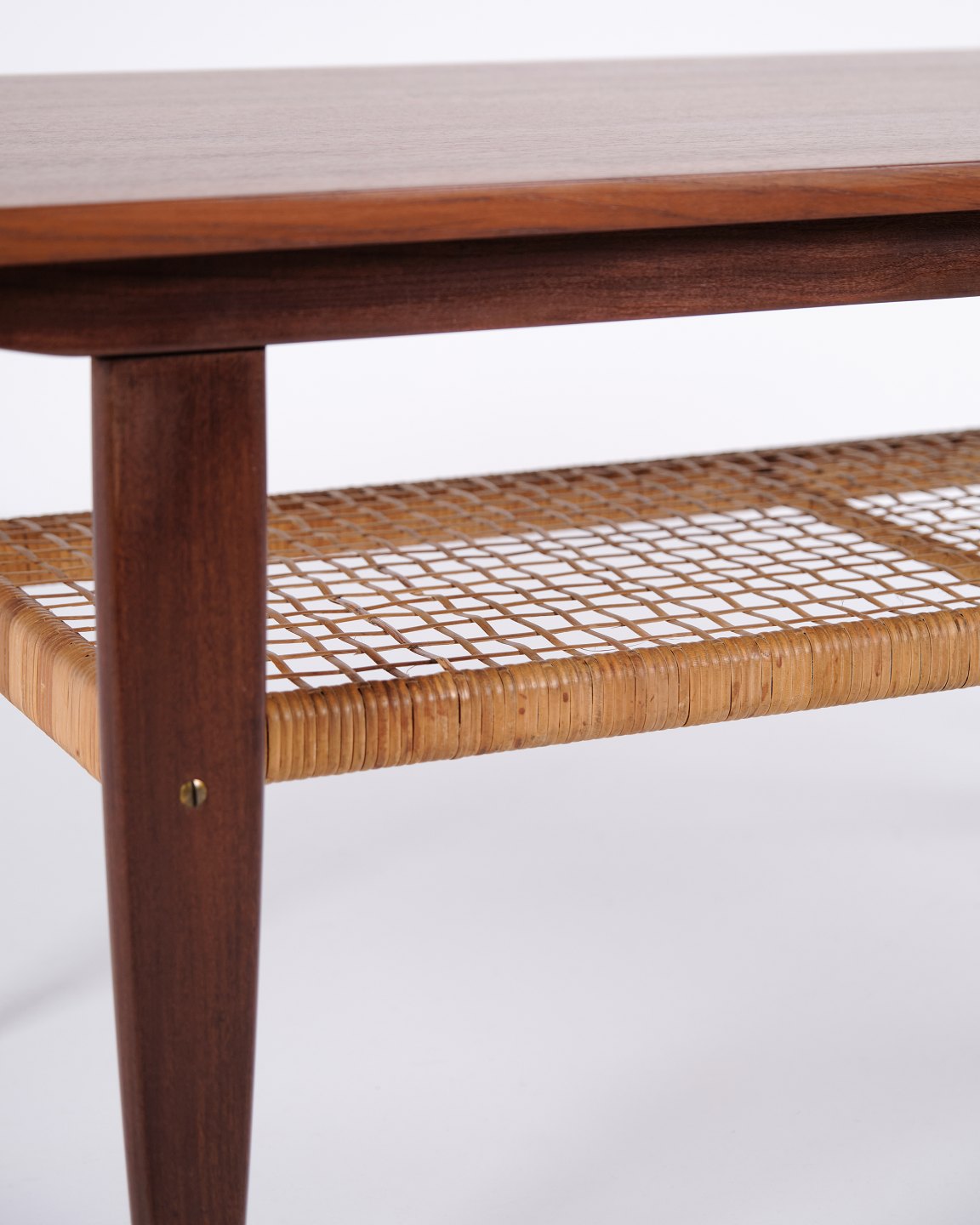 Coffee table made of teak with a shelf made of wicker from the 1960s. Classic Danish design.