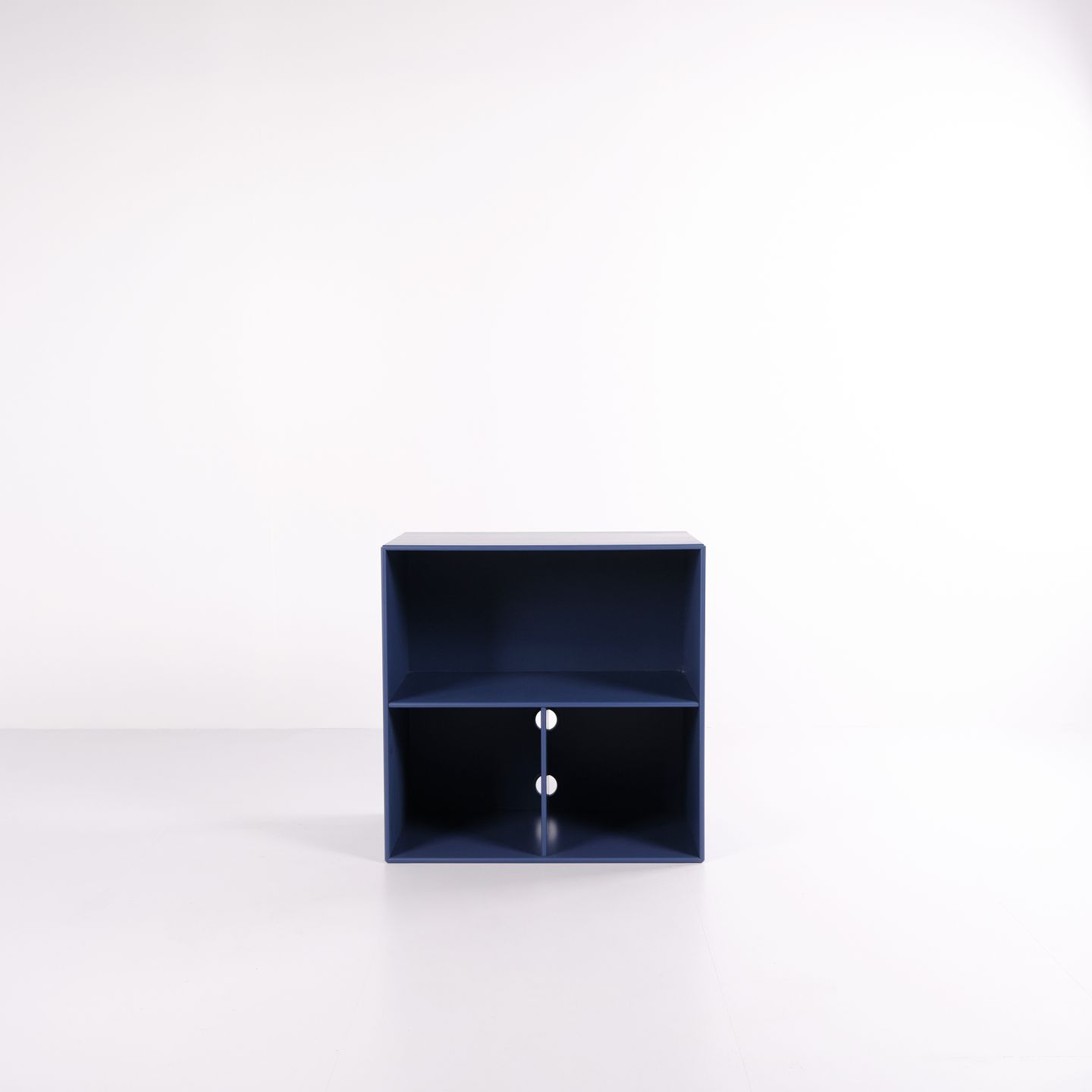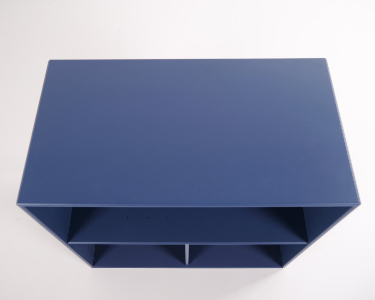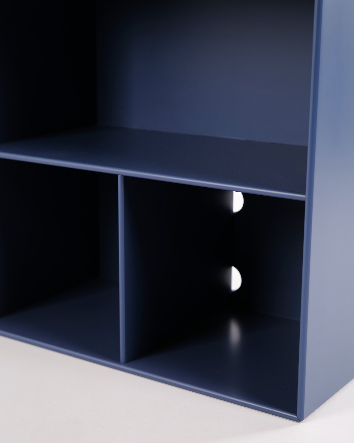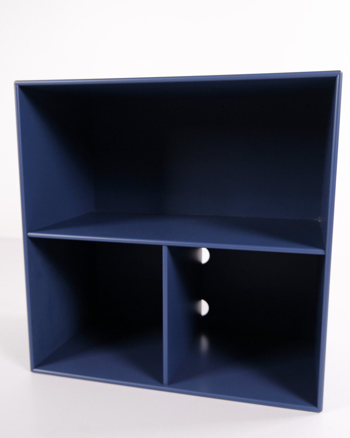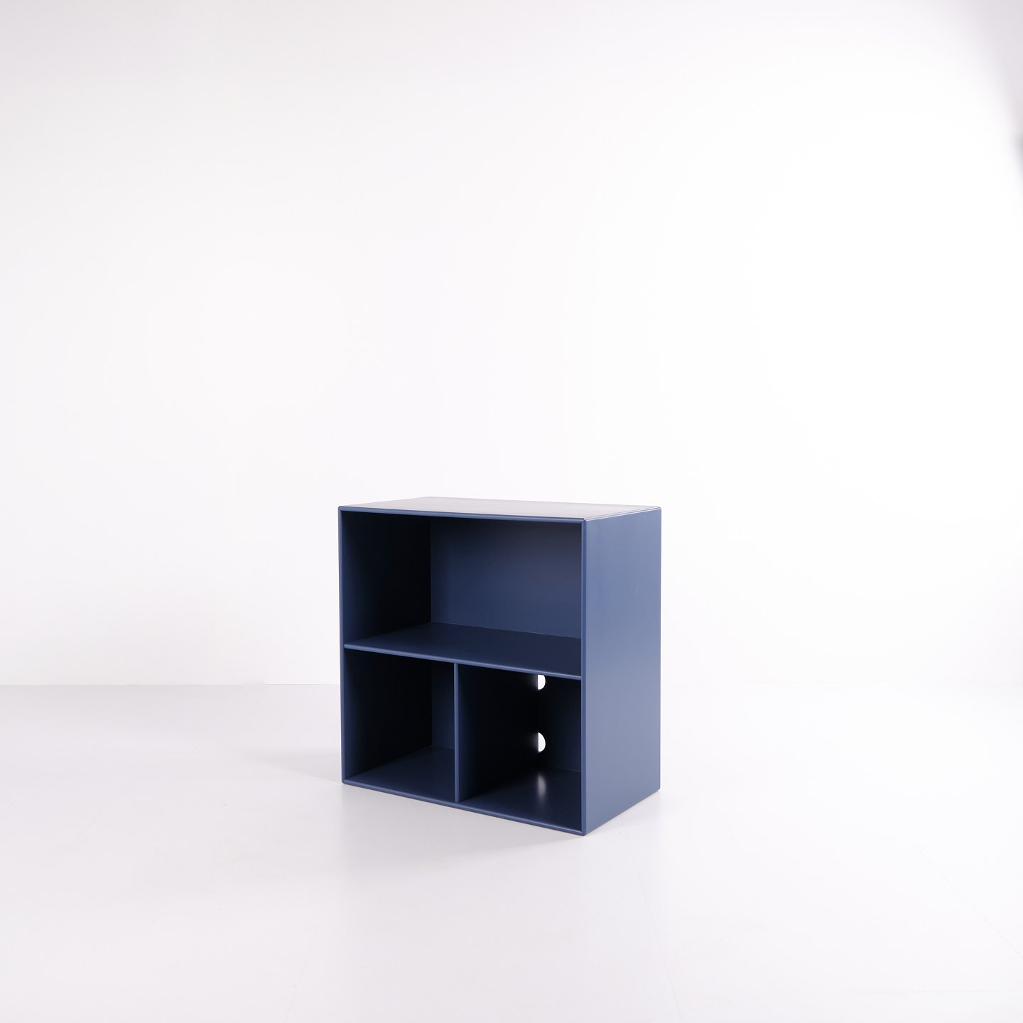 Montana reol i blå. Udstyret med tre åbne hylder, ideel til opbevaring eller udstilling i stue, kontor eller entré. Klassisk Montana-modul med enkel opbygning og høj funktionalitet.