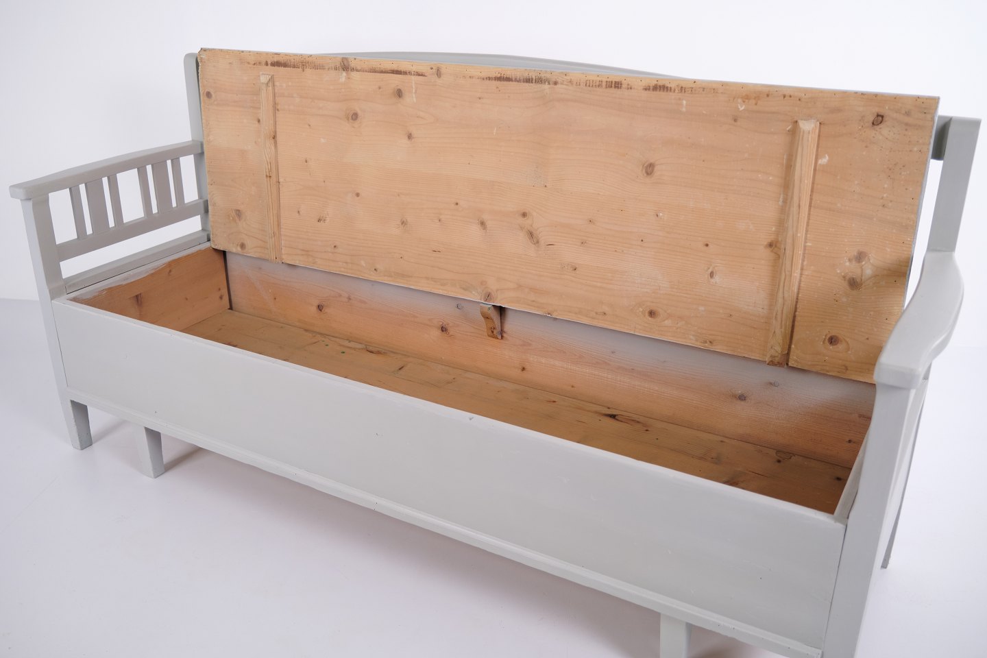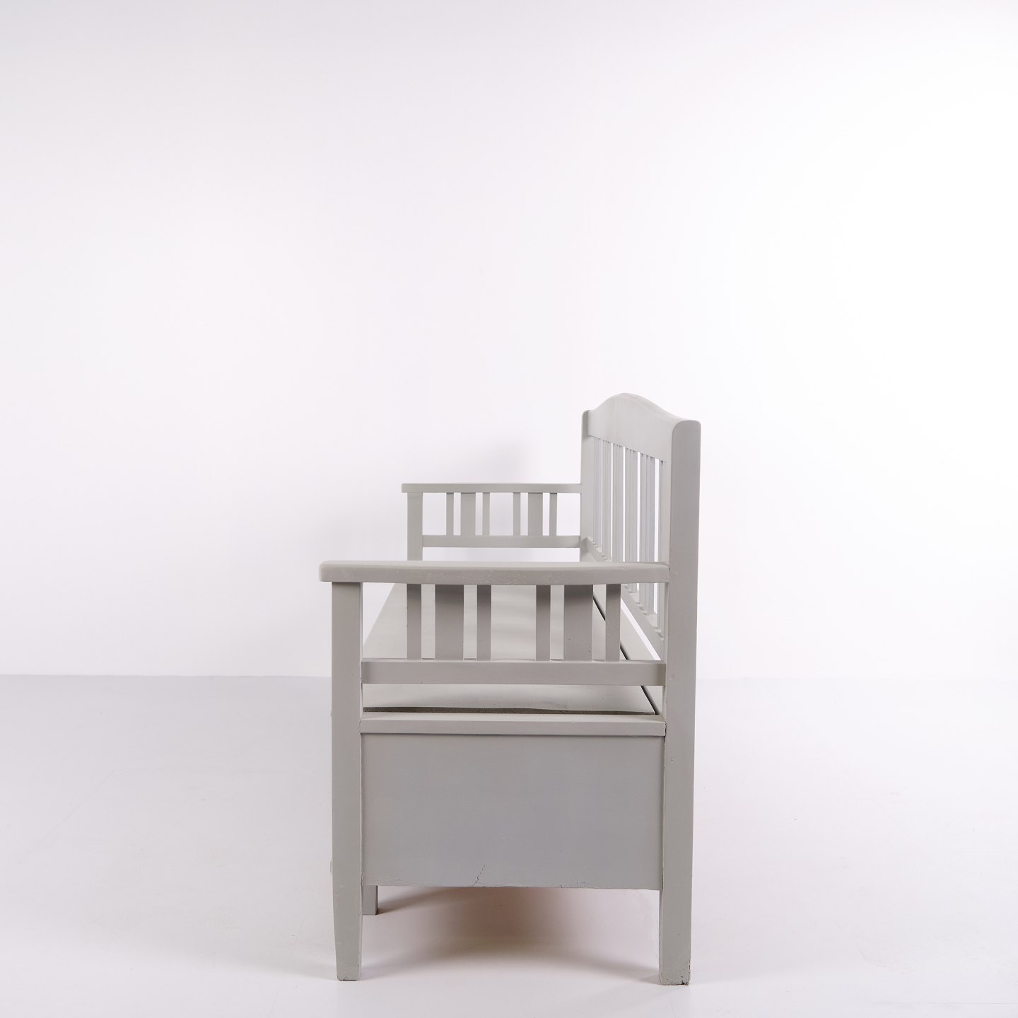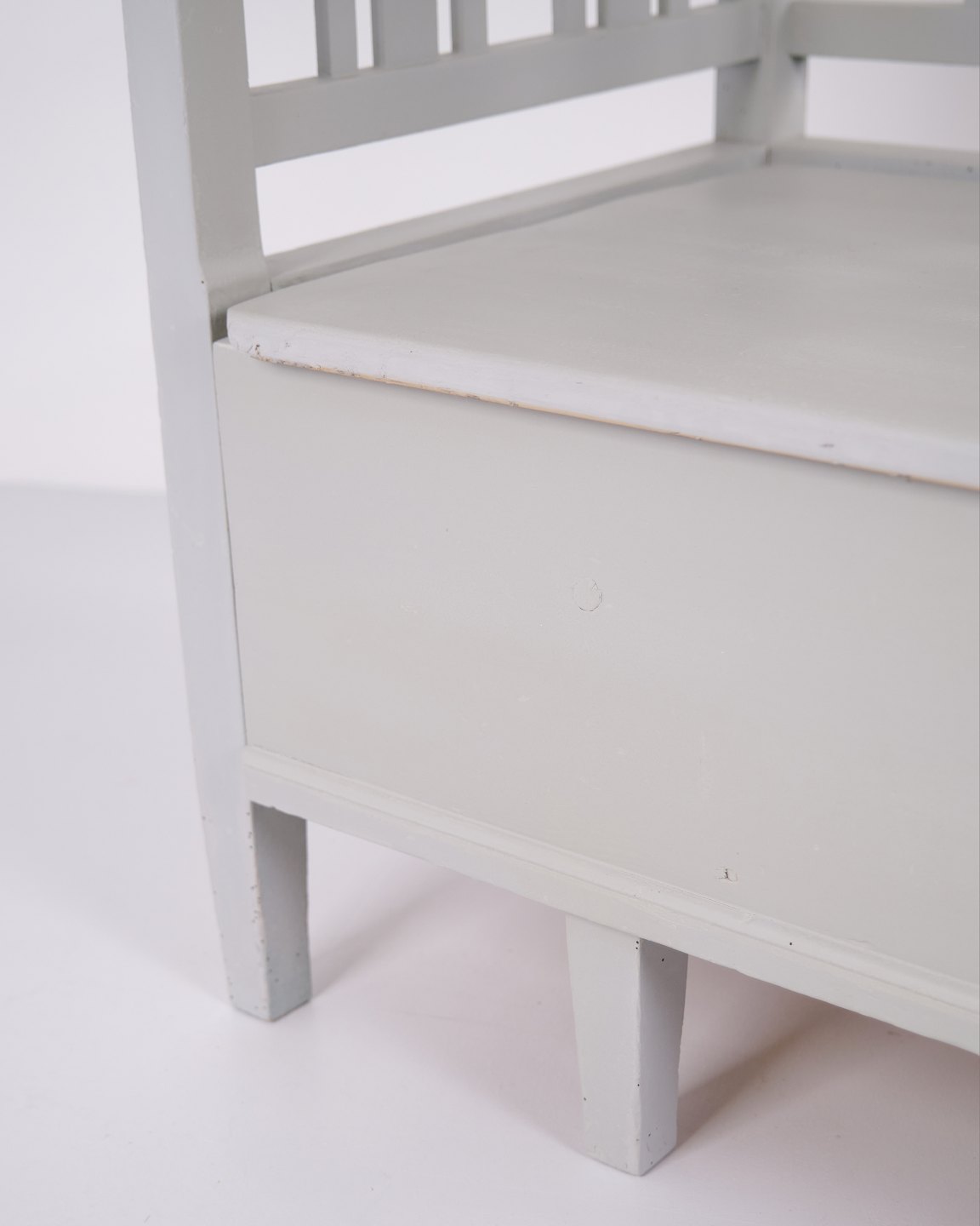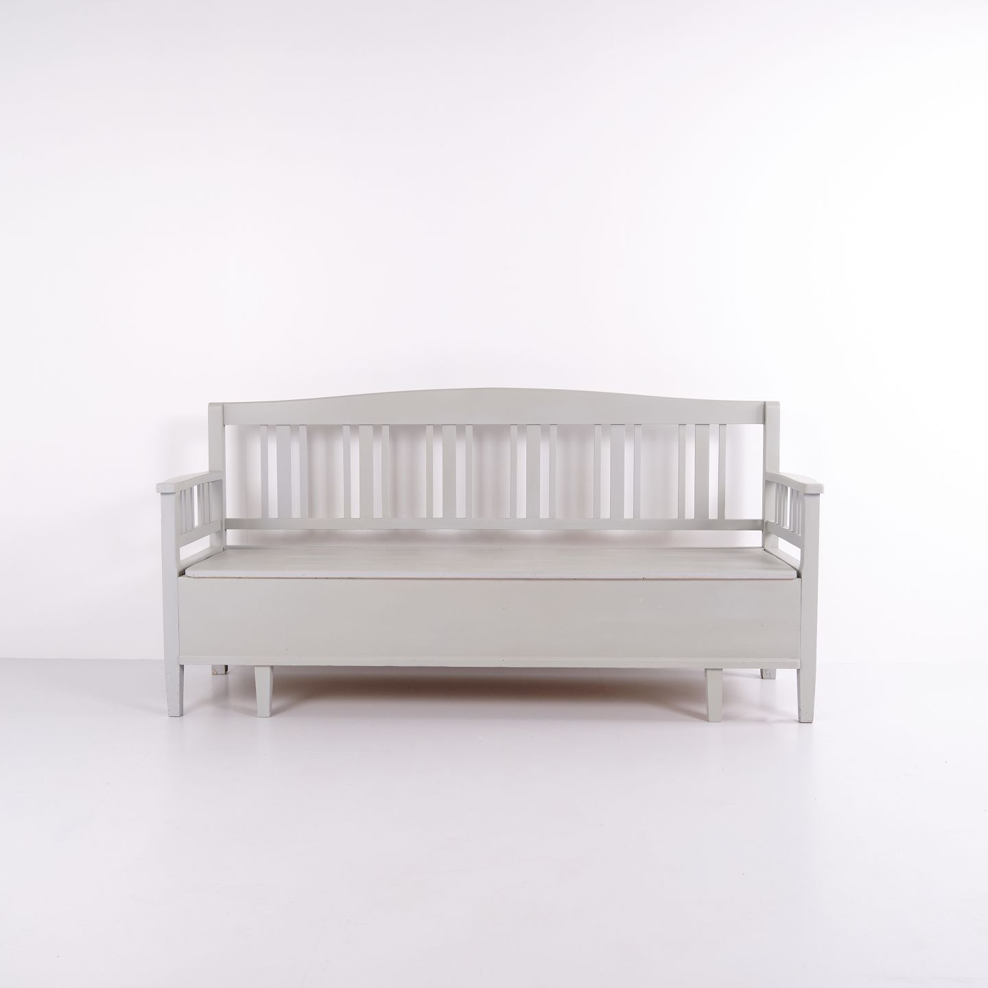 Swedish bench from the 1860s, made in pine and later painted grey. A classic Scandinavian piece with decorative painted details and practical storage beneath the seat. Well-preserved antique furniture with characteristic period features.