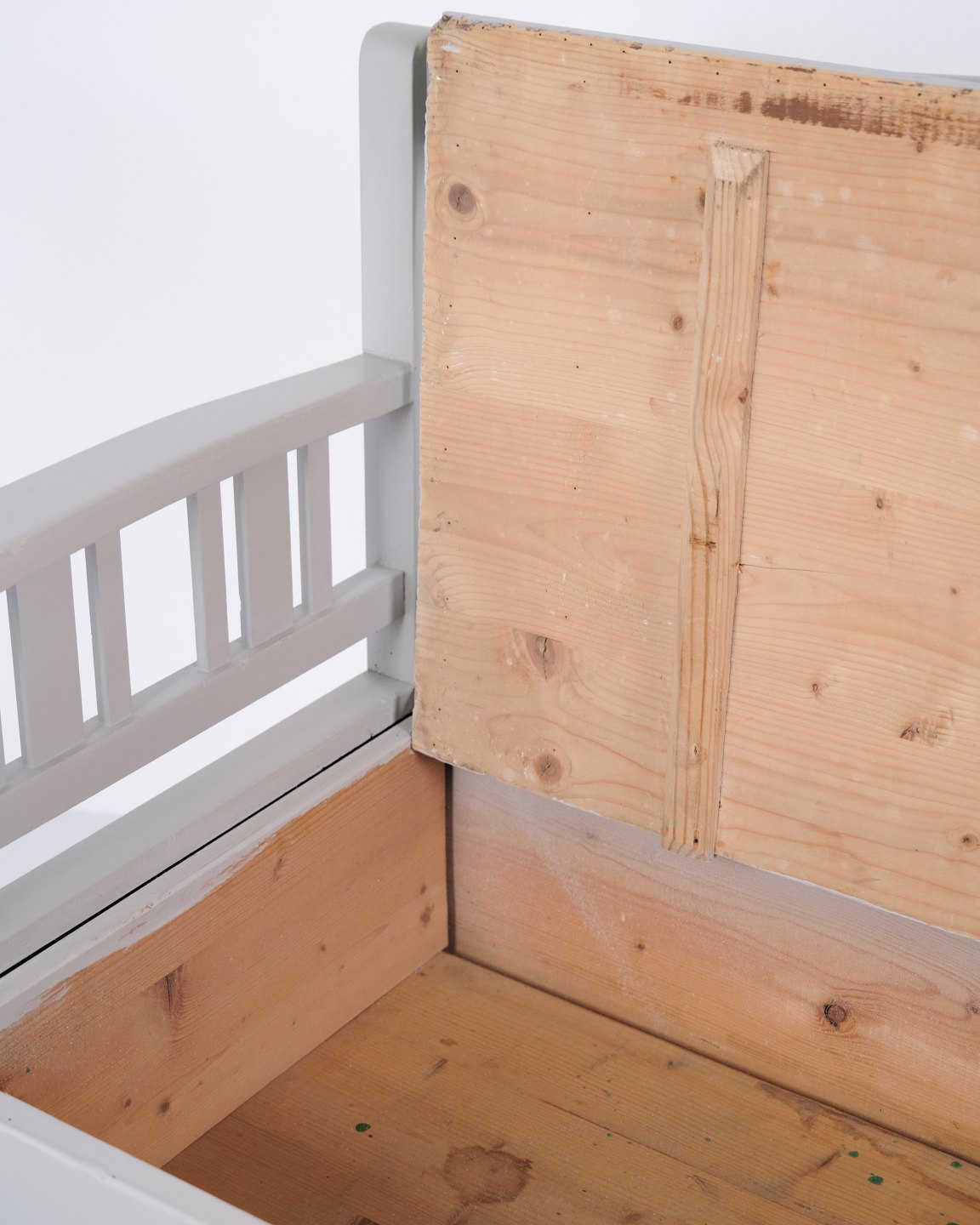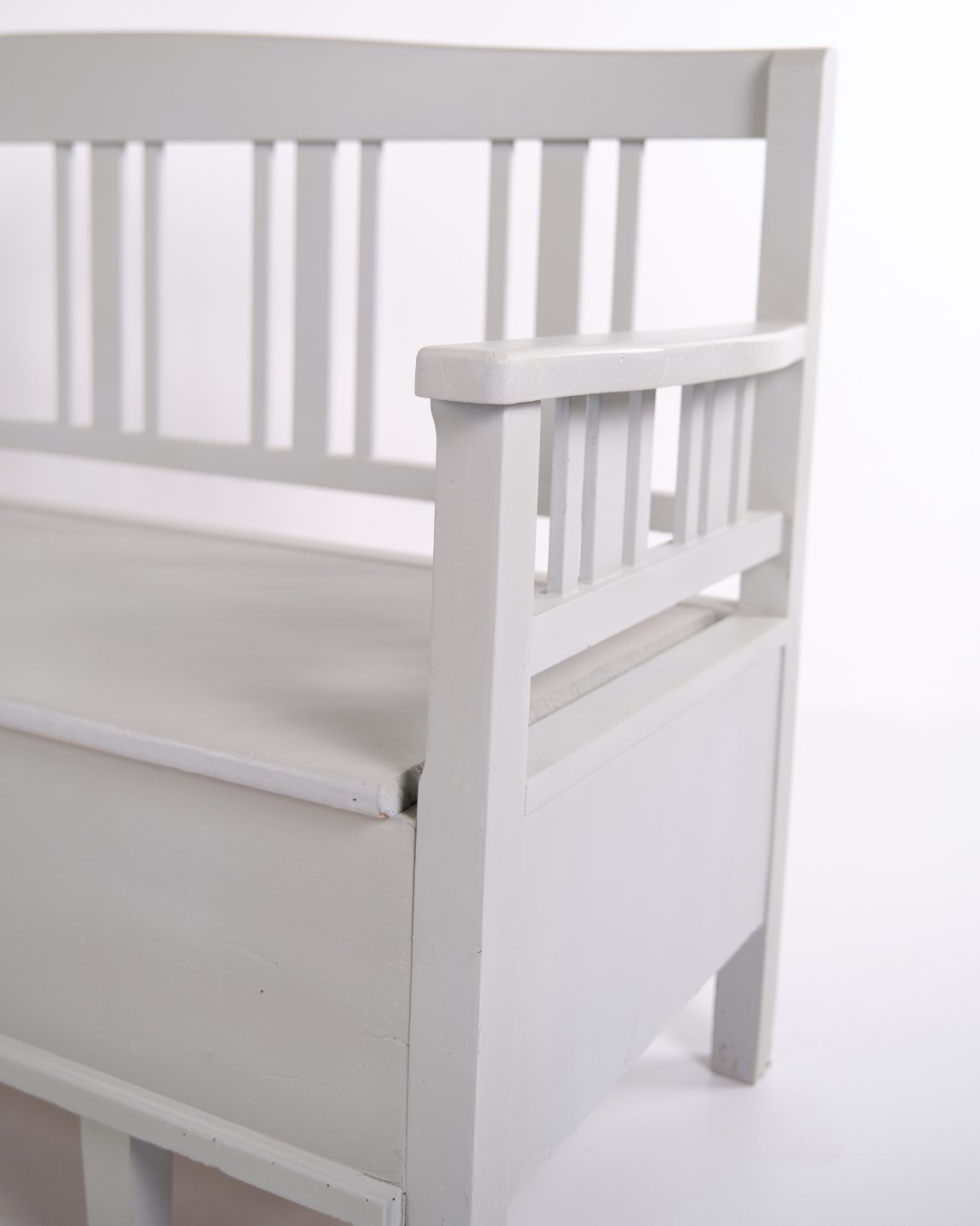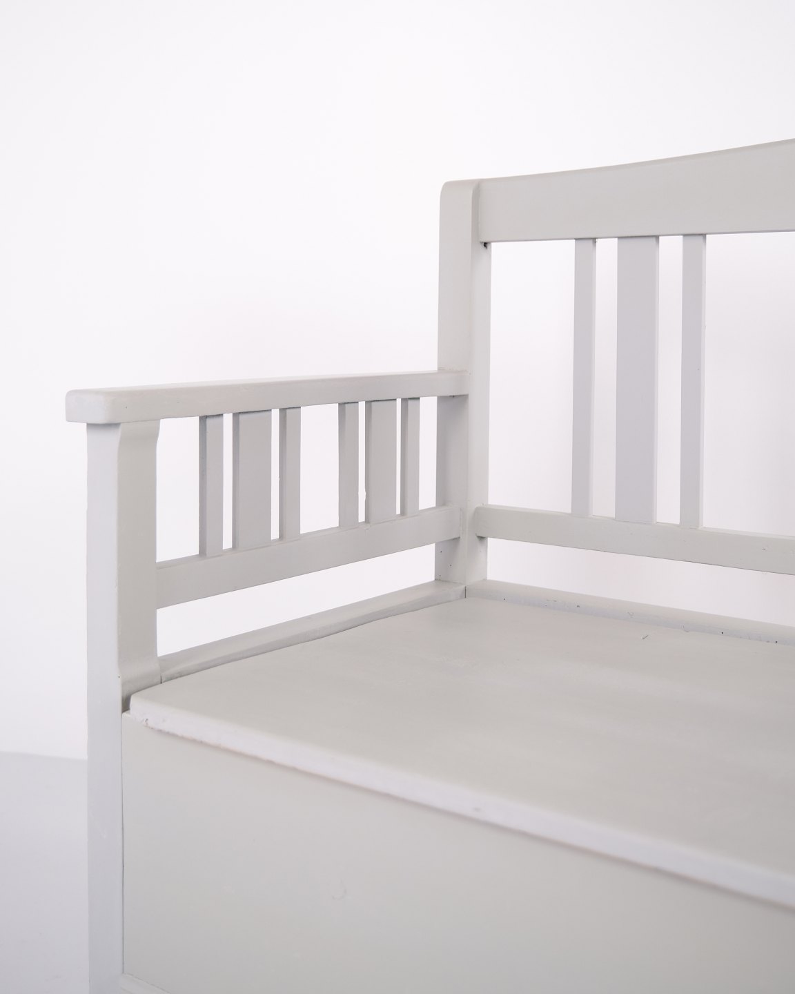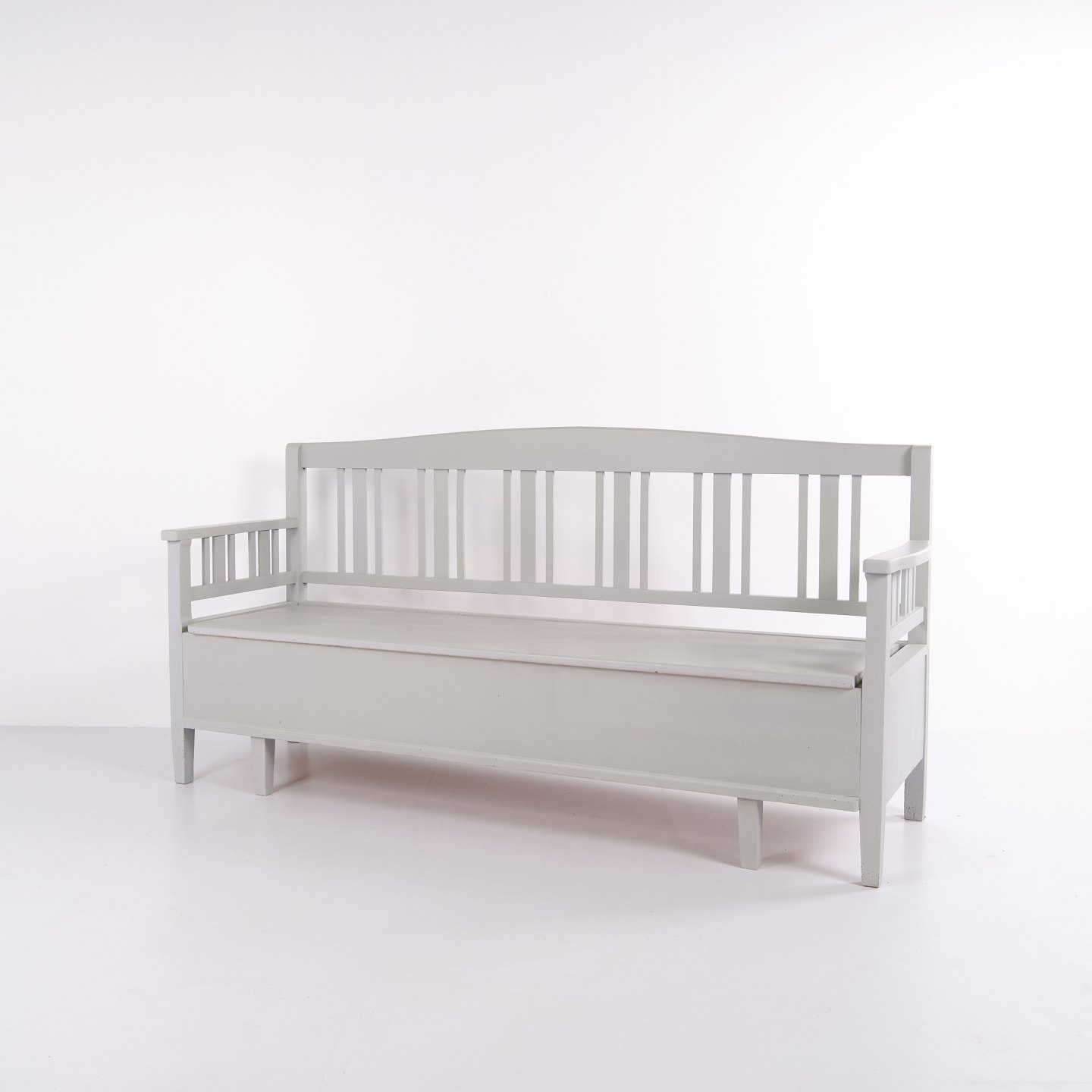 Swedish bench from the 1860s, made in pine and later painted grey. A classic Scandinavian piece with decorative painted details and practical storage beneath the seat. Well-preserved antique furniture with characteristic period features.