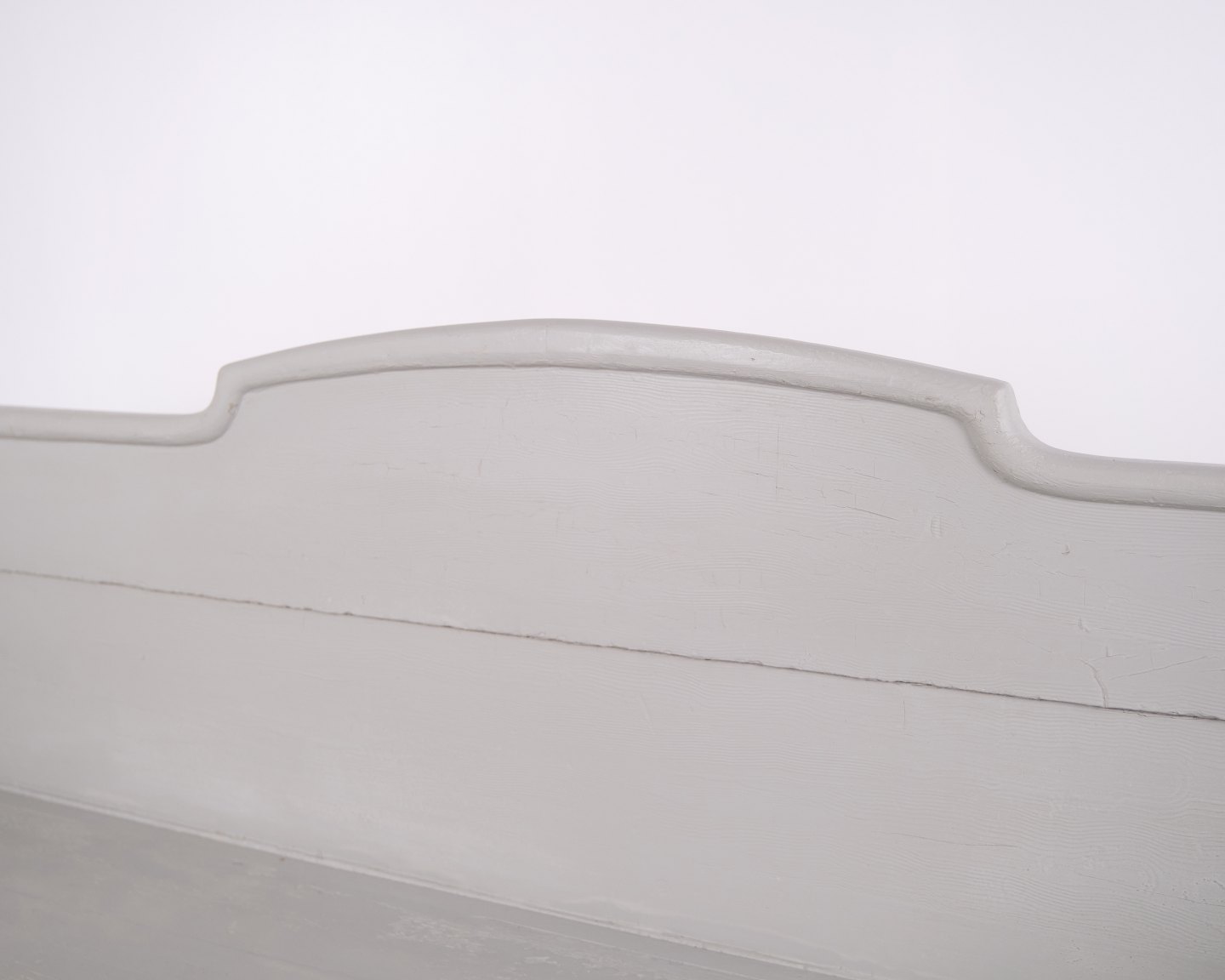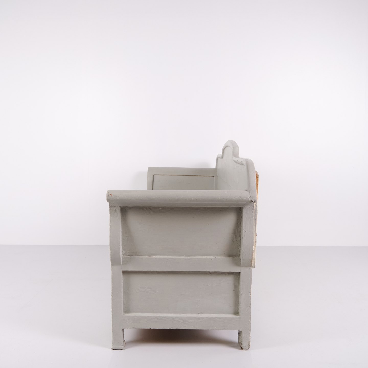 Antik slagbænk 1890’erne i gråmalet fyrretræ med opbevaring. Antik opbevaringsbænk 1800-tallet.