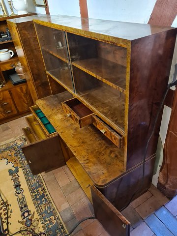 Funkis inspireret dækketøjsskab fra 1940'erne I birk og med glas skydelåger. Fremstår pænt, velholdt og udmærket funktionsdygtigt. Dog mangler en nøglehulskrans på skabsågen. (Billede)