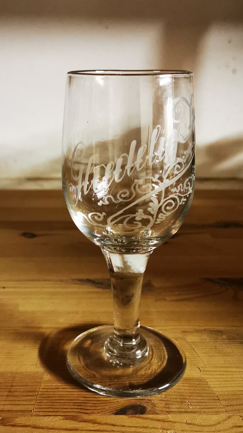 Don Carlos vinglas fra Aalborg Glasværk fra omkring 1900. Dekoreret med "Glædelig Jul". Fremstår i god stand uden skader eller reparationer. H. 18 cm