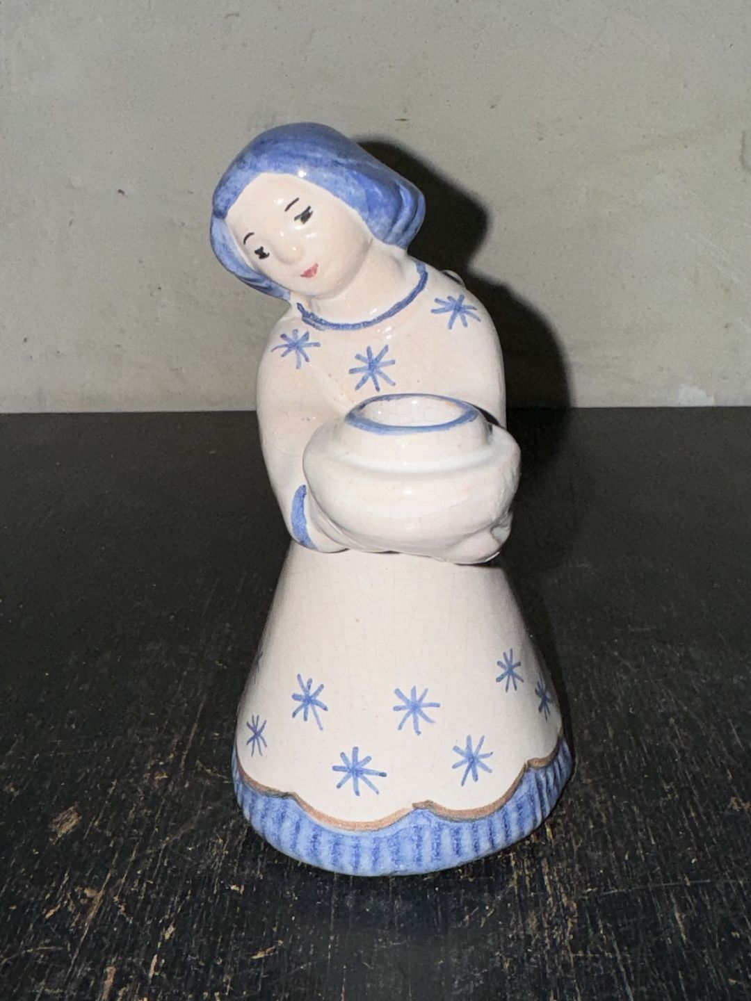 Figure of a painted angel in ceramic as a candle holder from the Bornholm pottery factory Lauritz Hjorth. In good condition. Factory mark on the bottom. H.12 cm