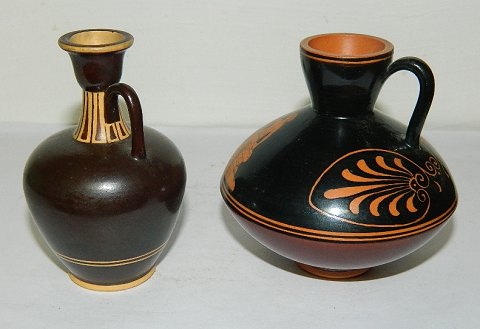 To mindre vaser i bemalet terracotta fra P. Ipsen, København. Fremstillet ca. 1880-1900. Bemalet med figurgrupper i græsk stil. Den buttede har et "nåle-stiks" skår der ses i form af en lys plet. Ellers fremstår begge i faktastisk stand. Fabriksmærkede på bunden med navn samt modelnummer. Hhv. 8½ cm og 9 cm høje.