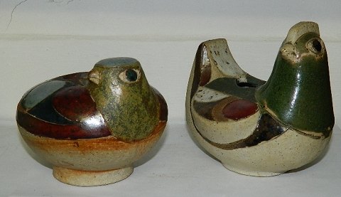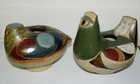 Due og høne i keramik af Julie Høm. Begge figurer fremstår i perfekt stand. Duen er 9 1/2 cm høj og 141/2 cm lang. Hønen er 13 cm høj og 14 cm lang. Kunstnersignatur JH på bunden.