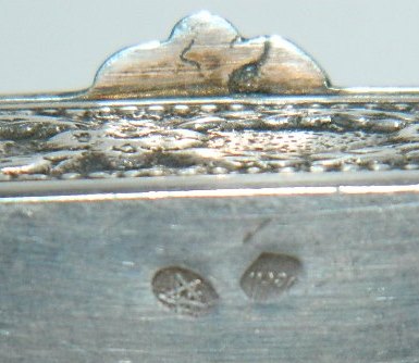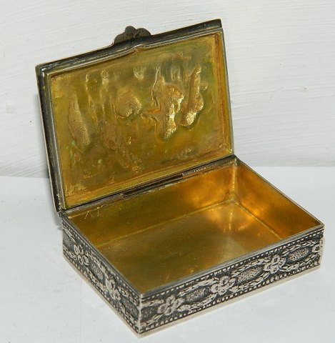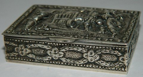 Pilleæske i sølv. Motiv i relief på låget. Forgyldt indenvendigt. Sølvstempler på bunden. Fremstillet sidste halvdel af 19. årh. Mål: 1½ cm høj - 5½ cm x 4 cm.