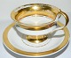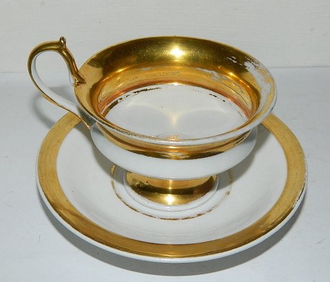 Royal Copenhagen empire porcelænskop fra omkring 1820. Fremstår i god stand uden skader eller reparationer. Brugsslid på guldet. Kop og underkop stemplet. 7½ cm høj incl. underkop.