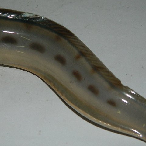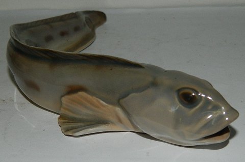 Figur i porcelæn af ål fra Bing & Grøndahl. Fremstillet i begyndelsen af 20. århundrede i Skønvirkeperioden. To skår på rygfinnen. Fabriksmærket på undersiden. Figuren er markeret som 2. sortering. 3½ cm høj 19 cm lang.