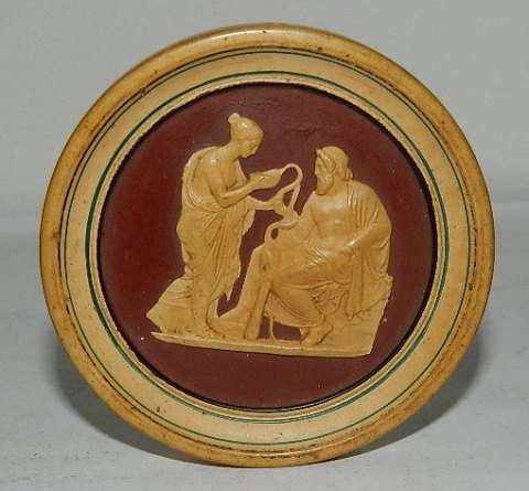 Miniature platte i teracotta fra Peter Ipsen, København, ca. 1880. Hygieia giver Æskulaps slange næring ("Sundhed"). Motiv efter Bertel Thorvaldsen relief modelleret i Rom 1808. Platten er i god stand. 6½ cm i diameter.