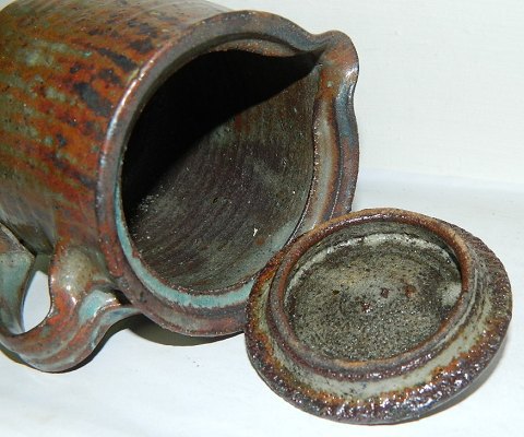 Kande med hank og låg i keramik udført af Gutte Eriksen. Fremstår i perfekt stand. Kunstnersignatur "G" under hanken. 13 cm høj.