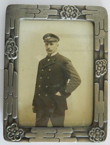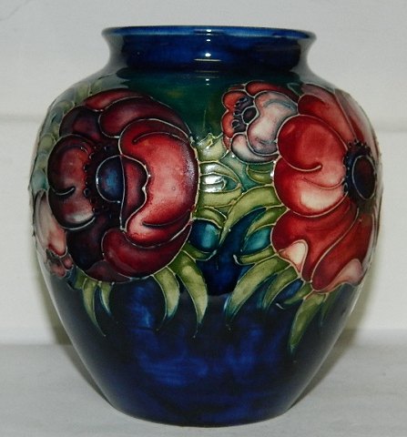 Blå vase i keramik fra Moorcroft, England. Dekoreret med blomster. I perfekt stand. Fabriksmærket på bunden. 13 cm høj.