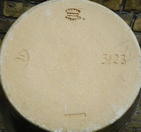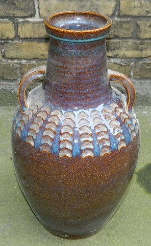 Stor krukke eller gulvvase i stentøj fra bornholmske Søholm. Udført i stil som græske lertøjskrukker, blot med klassisk dekoration samt glasurer fra Søholm fabrikken. I perfekt stand. 48 cm høj.