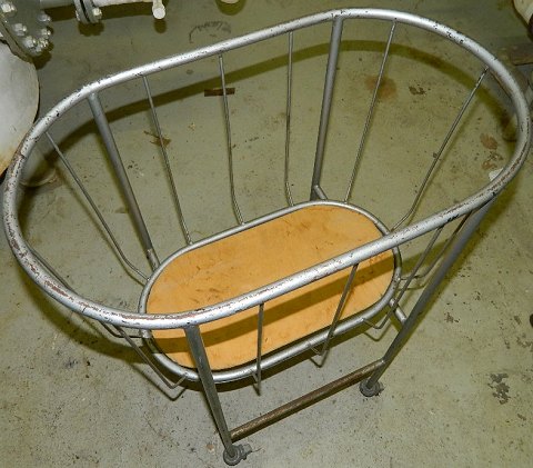 Vugge til spædbarn på hjul. Muligvist brugt på institution i 1930´erne. Flot metalarbejde. Bund af træ.