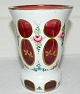 Drikkeglas fra Bøhmen. Rødt med mælkehvidt overfang. Fra ca. 1900. Dekoreret med blomster. Stort slid på undersiden, der indikerer brug gennem mange år. I perfekt stand. 12½ cm højt.