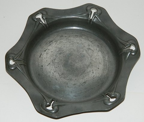 Skønvirkefad i tin af Mogens Ballin (1871-1914). Fremstår i god stand. Dekoreret med gennembrudt kant. Kunstnersignatur på bagsiden. 3½ cm høj og 25½ cm i omkreds. LIGNENDE KØBES