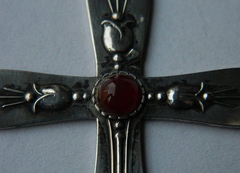 Pendant in the form of crosses in silver 830S. Decorated with flowers and red stones. In perfect condition. Silver Stamped on the back with unknown maker's mark. 6 cm long.