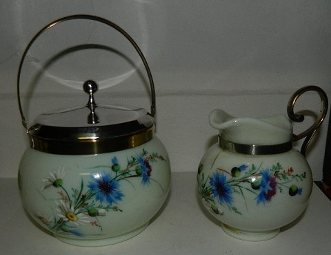 Metalbesat sukkerskål og flødekande i opalineglas. Dekoreret med blomster. I perfekt stand. Fremstillet omkring 1900 i Frankrig. Almindeligt brugsslid på metallet. Sukkerskålen er 12½ cm høj incl. lågknop.