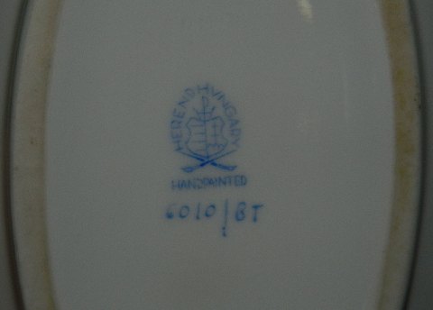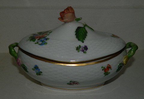 Lille terrin eller lågskål fra Herend fabrikken i Ungarn. Blomsten på låget mangler sin stilk. Ellers i god stand. Fabriksmærket på bunden. 18½ cm lang.