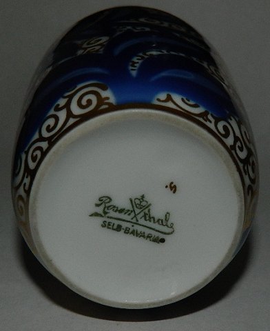 Vase i porcelæn fra Rosenthal, Tyskland ca. 1920. Jugend dekoration i blåt og guld. I perfekt stand. Fabriksmærket på bunden. 14½ cm høj.